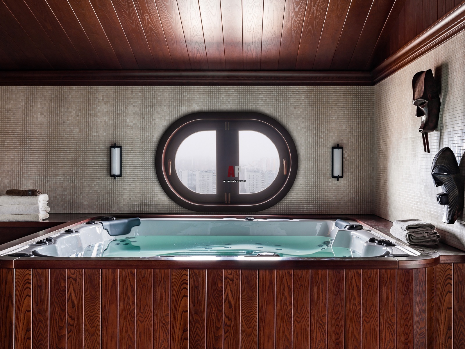 Домашний SPA-комплекс – продолжение второго этажа. Гидромассажный бассейн, Pool Spa. На полу – мраморная мозаика и мраморные слэбы. Боковой фронт джакузи отделан деревом. На стене – африканские маски, привезенные хозяином из путешествий.