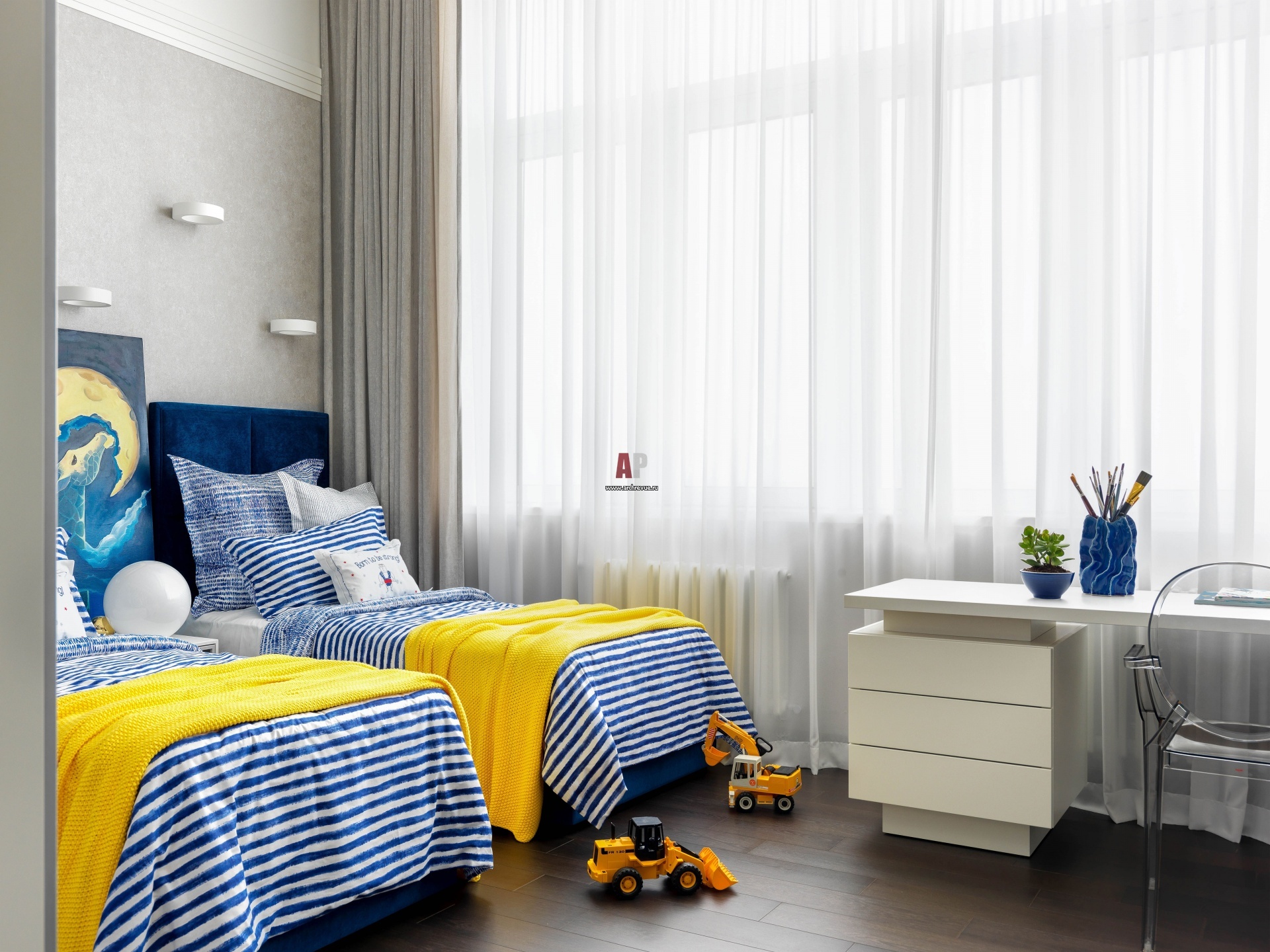 Детская для двоих сыновей разделена на две зоны: спальную и рабочую. Они выделены разными цветами. Стеллаж, шкафы и кровати выполнены на заказ.