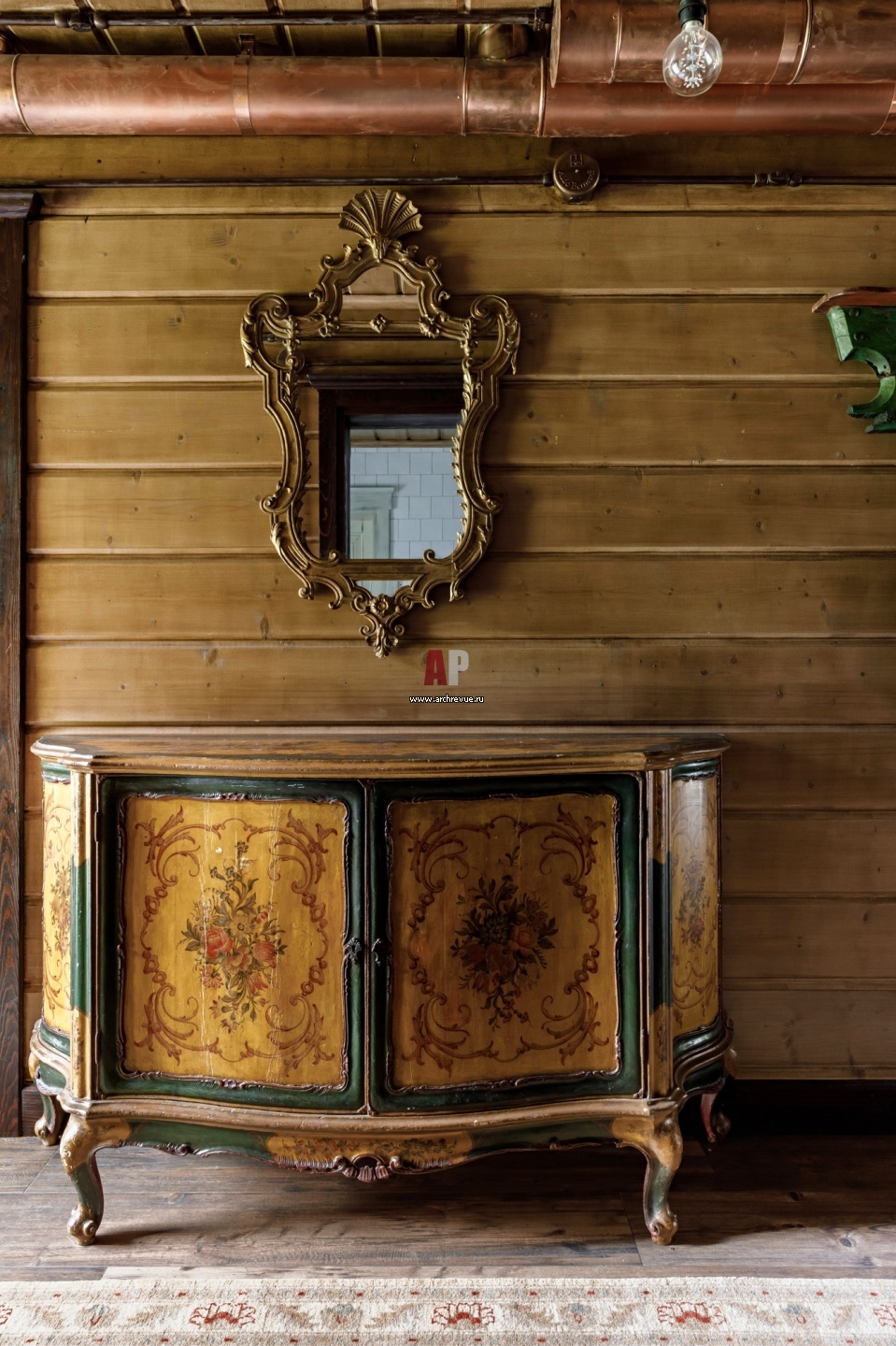 Деревянный дом в стиле шале. Фрагмент прихожей. Консоль антикварная.