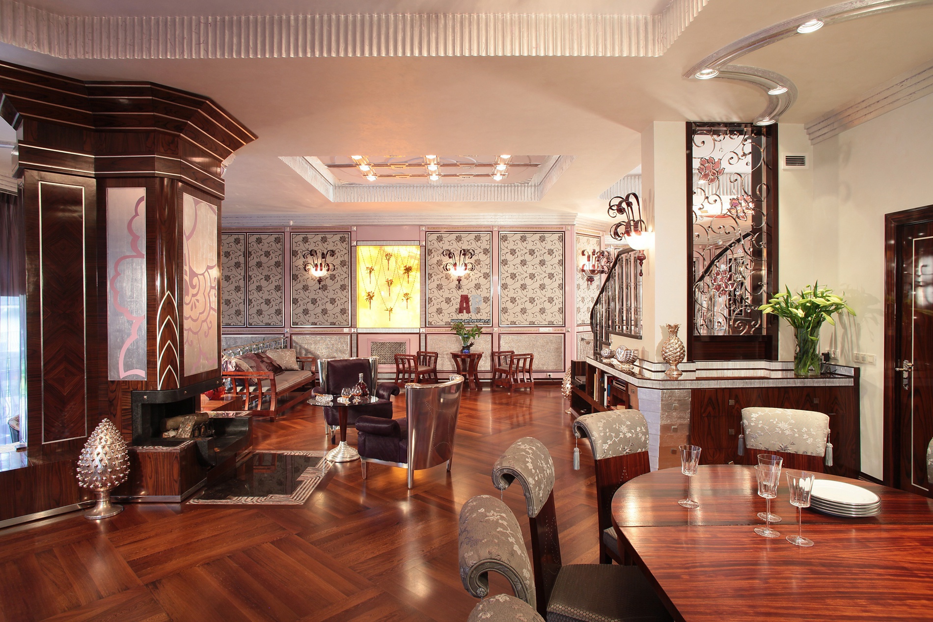 Интерьер столовой. Для украшения дома использовались витражи, чеканка, хрустальные занавеси, лепнина, настенные росписи.