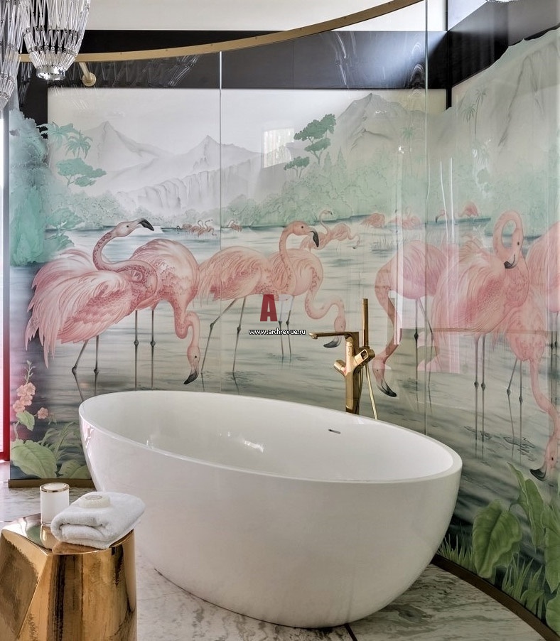 Радиусная ширма в ванной изготовлена из молированного стекла. Роспись по пескоструйному рисунку с изображением фламинго – художник Юрий Столяров. Ванна, Vallone. Люстры, Vistosi. Золотой столик, Pianca.