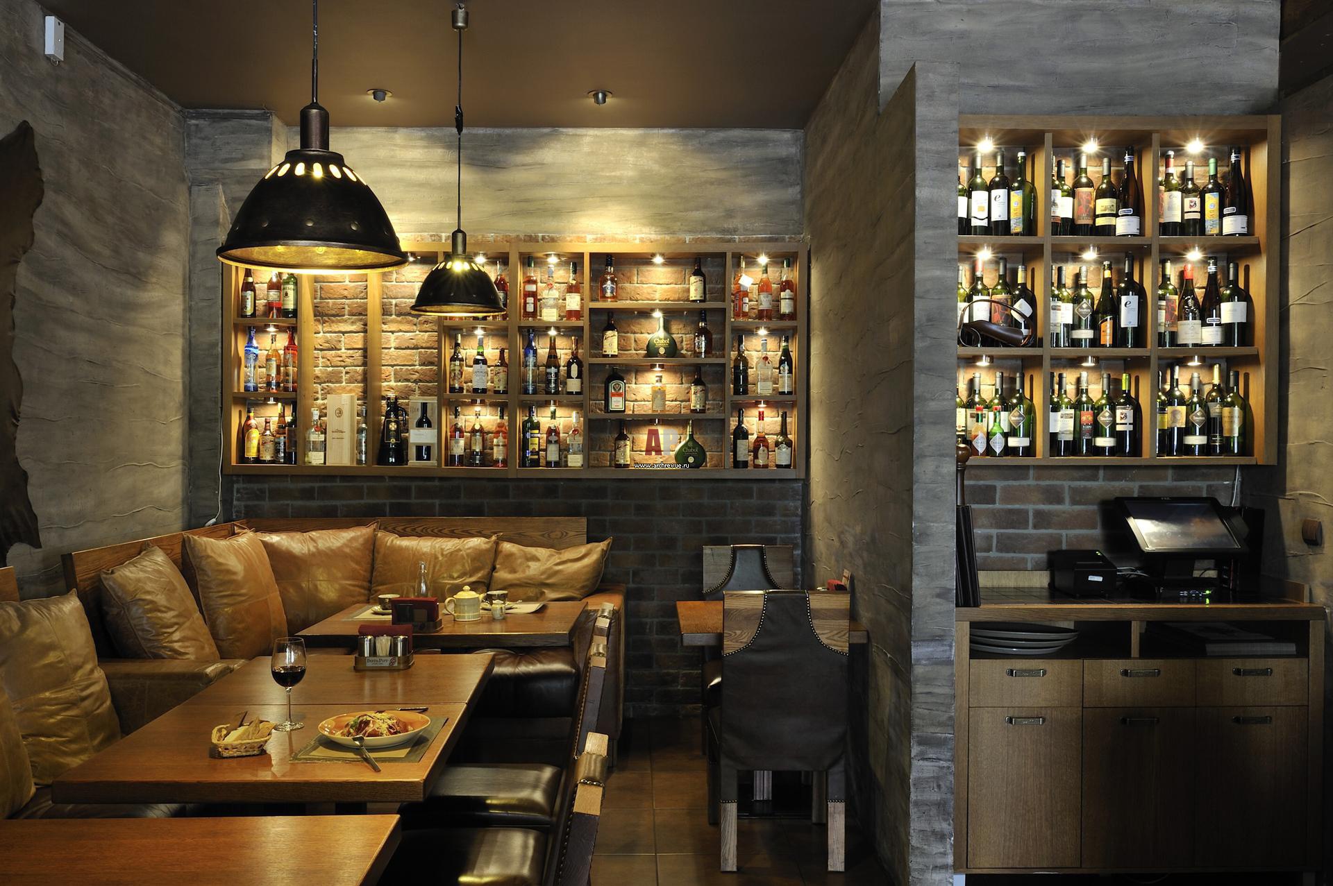 Мягкие диваны из рыжей кожи с высокими спинками и стулья, декорированные проклепанной кожей, созданы по эскизам авторов проекта мастерами российского мебельного производства Beni.