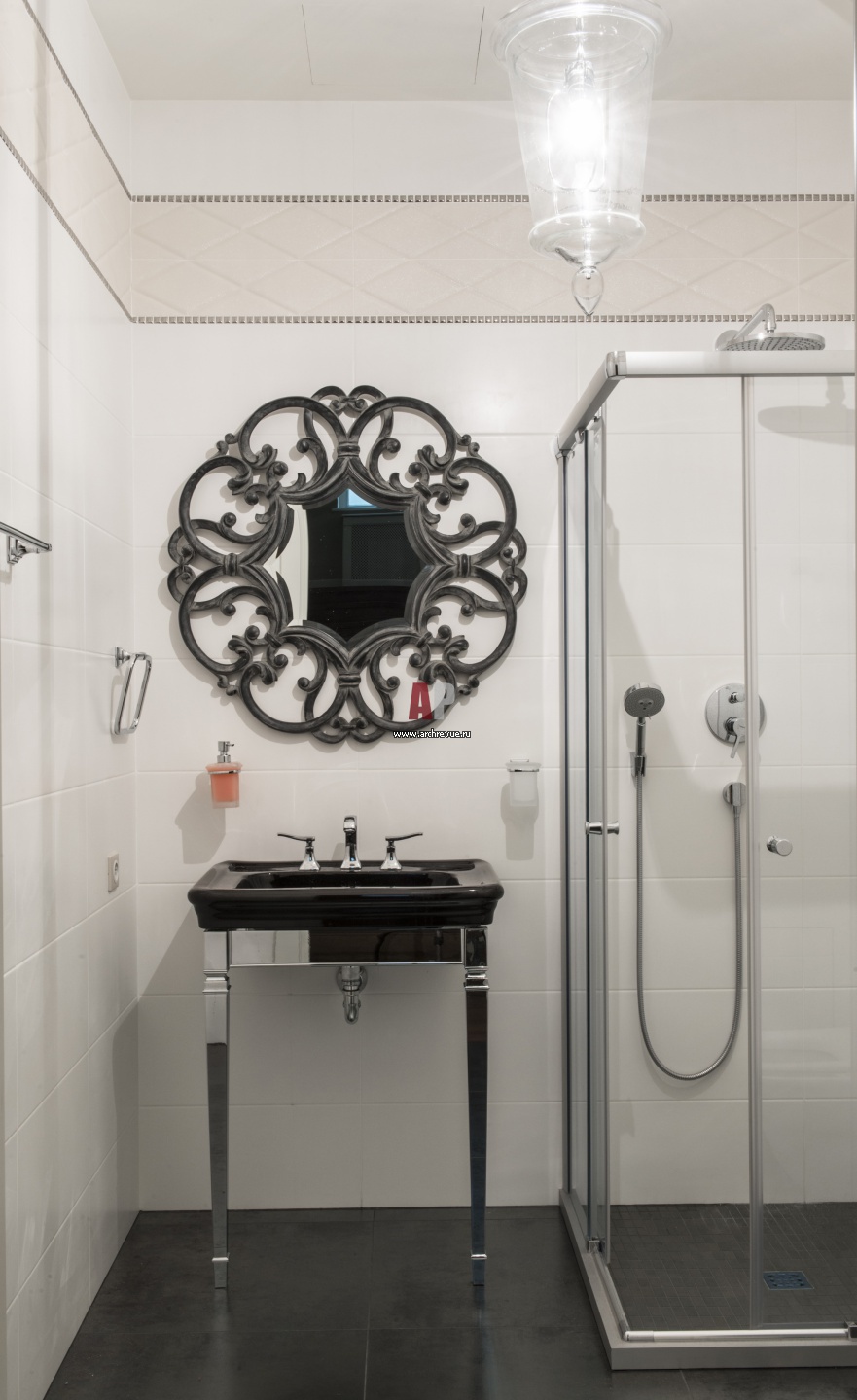 Интерьер санузла в контрастной серно-белой гамме. Черный умывальник на изящных ножках из серебристого металла.