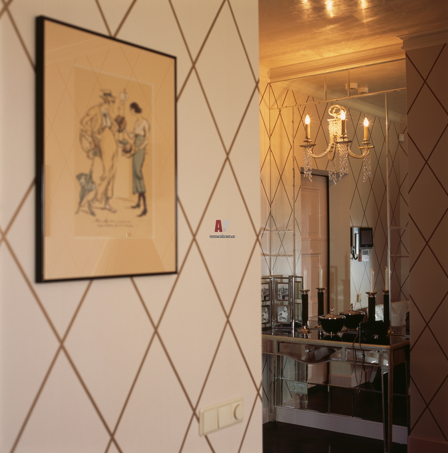 С зеркальной стеной в прихожей гармонирует зеркальная консоль, поставщик Park Avenue. Стены украшены оригинальными скетчами французских художников начала ХХ века.
