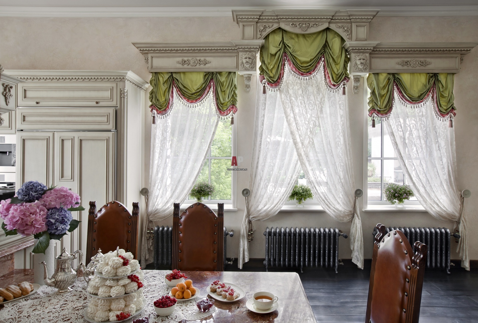 Яркие римские шторы подчеркивают белизну классической кухни с ордерными элементами. В качестве тюля используется шотландское хлопковое кружево Morton Young & Borland со старинным рисунком.