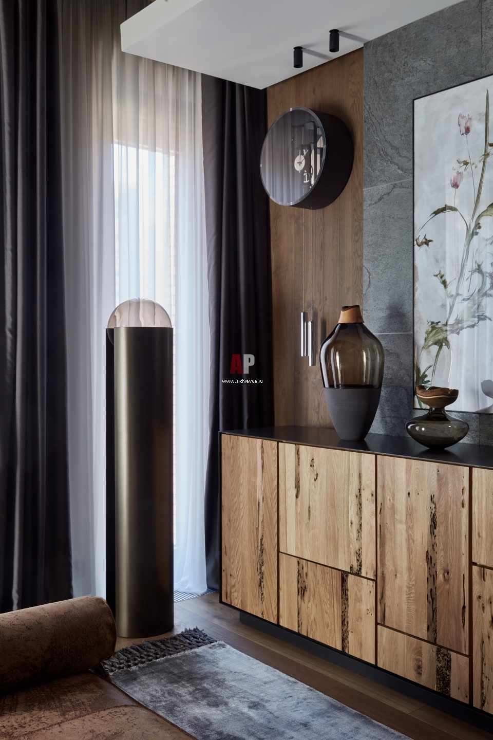 Квартира с природными материалами и фактурами. Интерьер спальни. На стенах – панели из натурального дуба и шпона камня. Комод Riva 1920 сделан из металла и деревянных свай, на которых стоят венецианские дома. Торшер, Flou. Настенные часы, Gallotti & Radice.