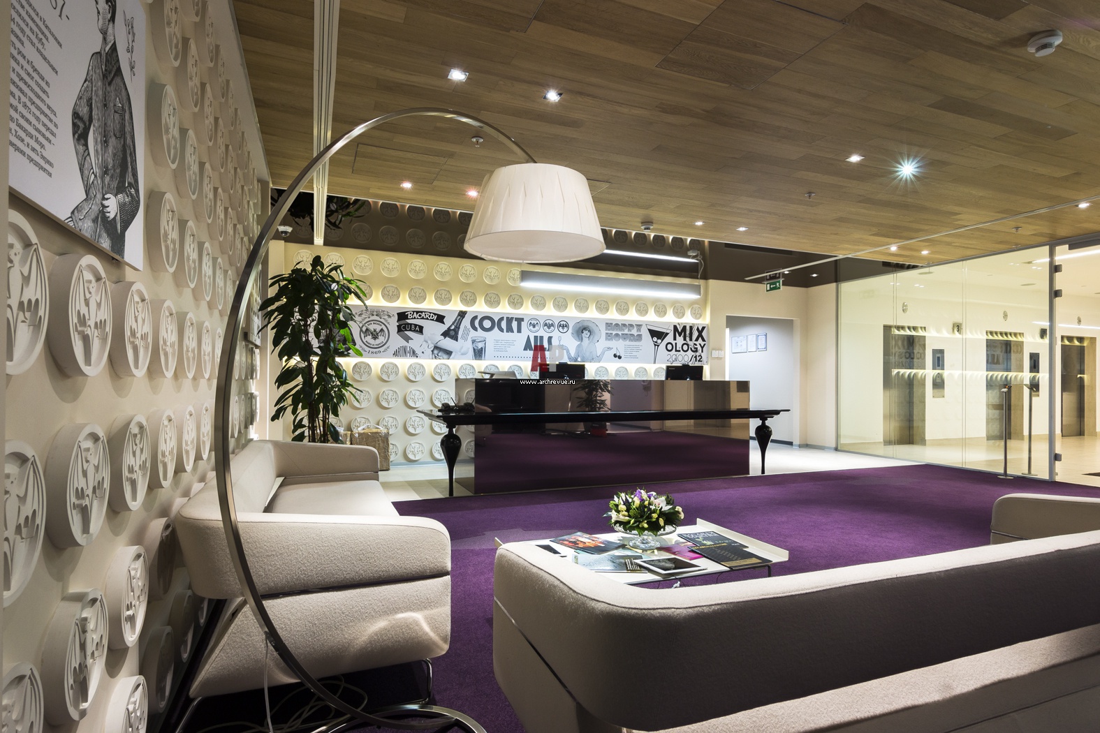 Презентационная часть офиса. Входная группа с ресепшен и приемной. Потолки зашиты деревом. На стенах – рельефы с фирменными летучими мышами Bacardi.