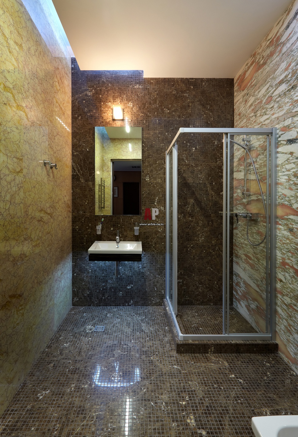 Душевая зона в санузле офиса. Пестрый мрамор и шоколадно-золотистая мозаика использованы в отделке помещения.