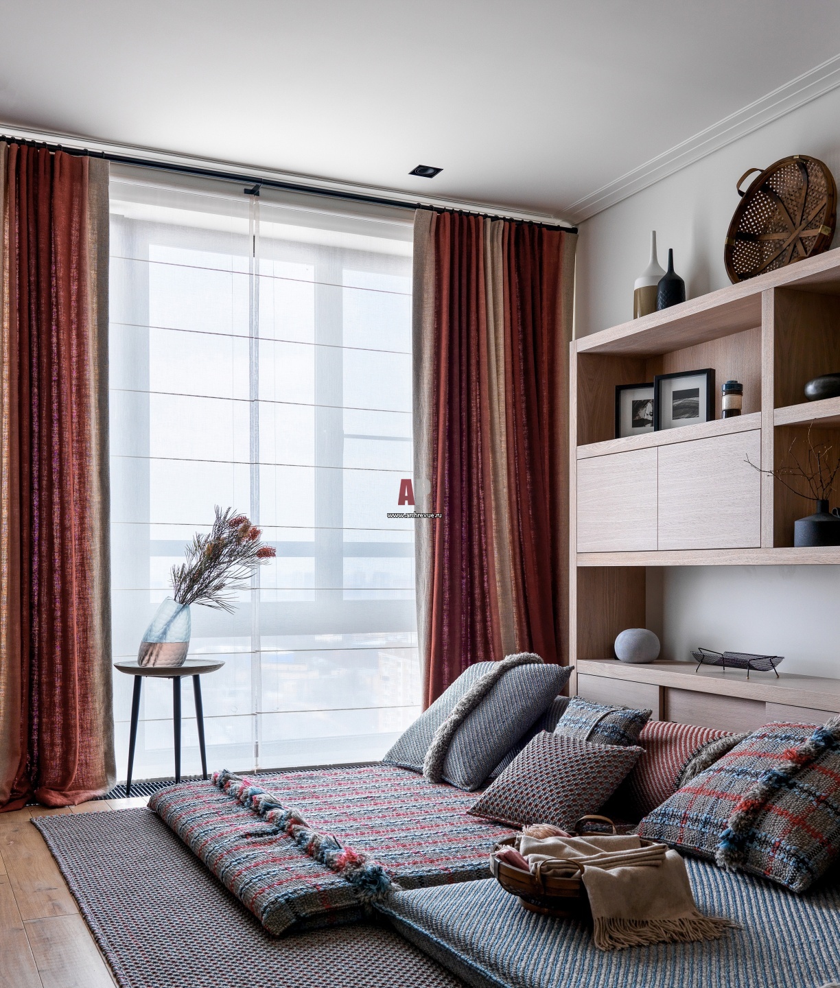 Медиа-комната для семейного досуга. Стеллаж изготовлен на заказ по эскизам дизайнера. Мягкая группа (матрасы, подушки и ковры), GAN. Ткани, Pierre Frey. Аксессуары, Cyan Design.