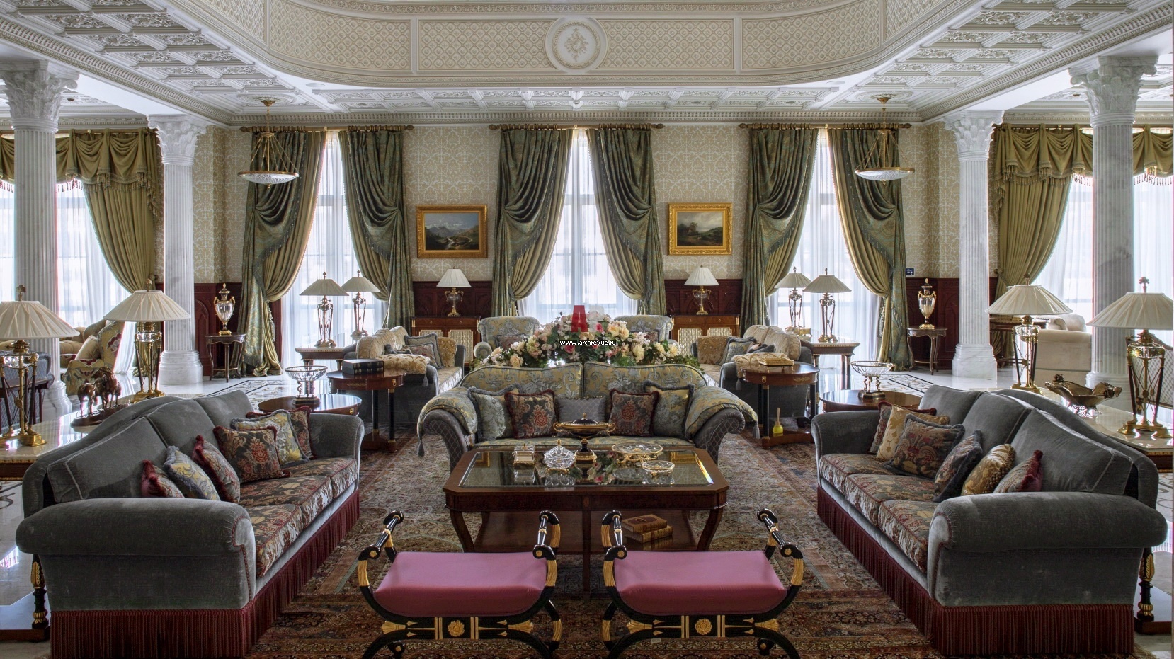 Парадная гостиная на первом этаже решена в стилистике классического европейского дворца. Колонны с резными капителями выполнены из белого мрамора. Кессонные потолки украшены нарядной гипсовой лепниной. Низ стен оформлен буазери из красного дерева, верх – декоративной штукатуркой с трафаретной росписью. На полу – шелковые ковры ручной работы.