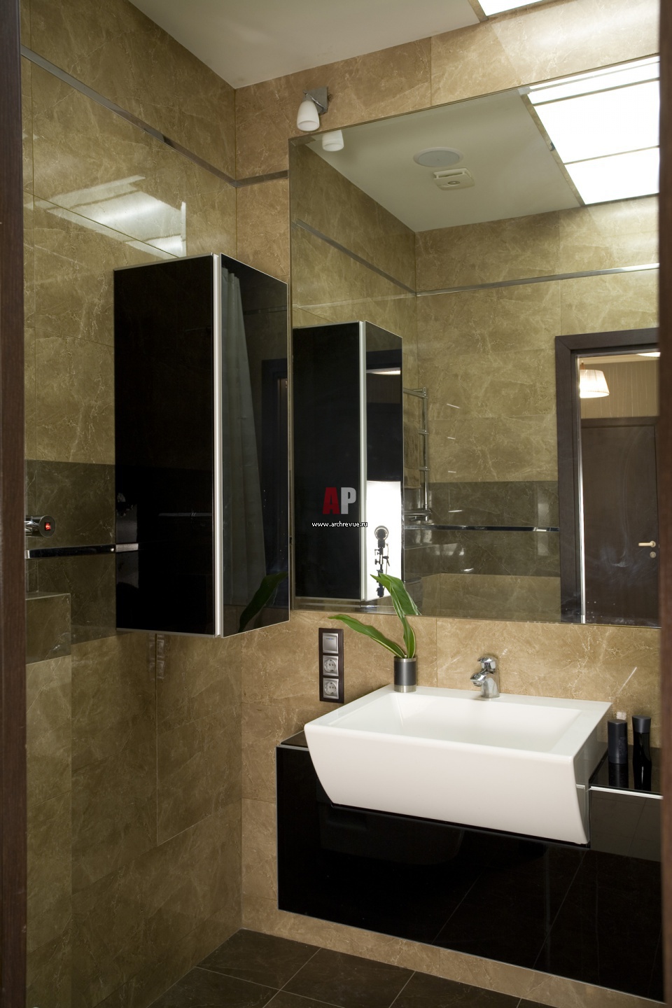 Интерьер гостевого санузла оформлен в бежевых тонах. Мебель и сантехника строгих геометрических форм.