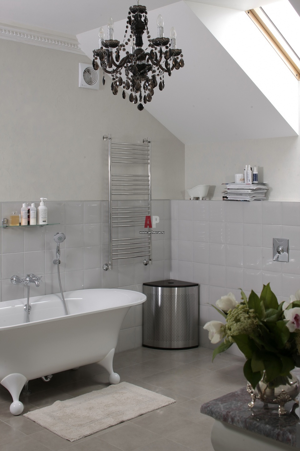 Интерьер главного санузла дома в стиле фьюжн. Он строится на контрасте черного и белого.