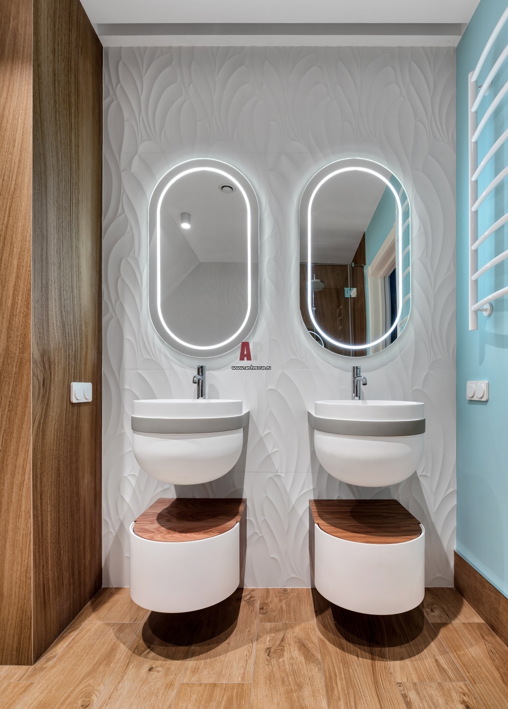 Детский санузел оформлен в пастельной, «зефирной», палитре. Пол и стены облицованы керамогранитом, Porcelanosa, линии URBATEK и KRION. Умывальники, Noken.