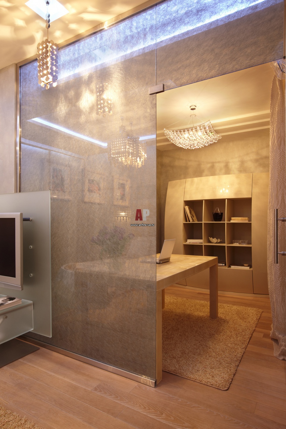 Вид из спальни на кабинет. Между стеклами перегородки вставлена ткань с эффектом муара, изготовление «Атлантик-СТ».