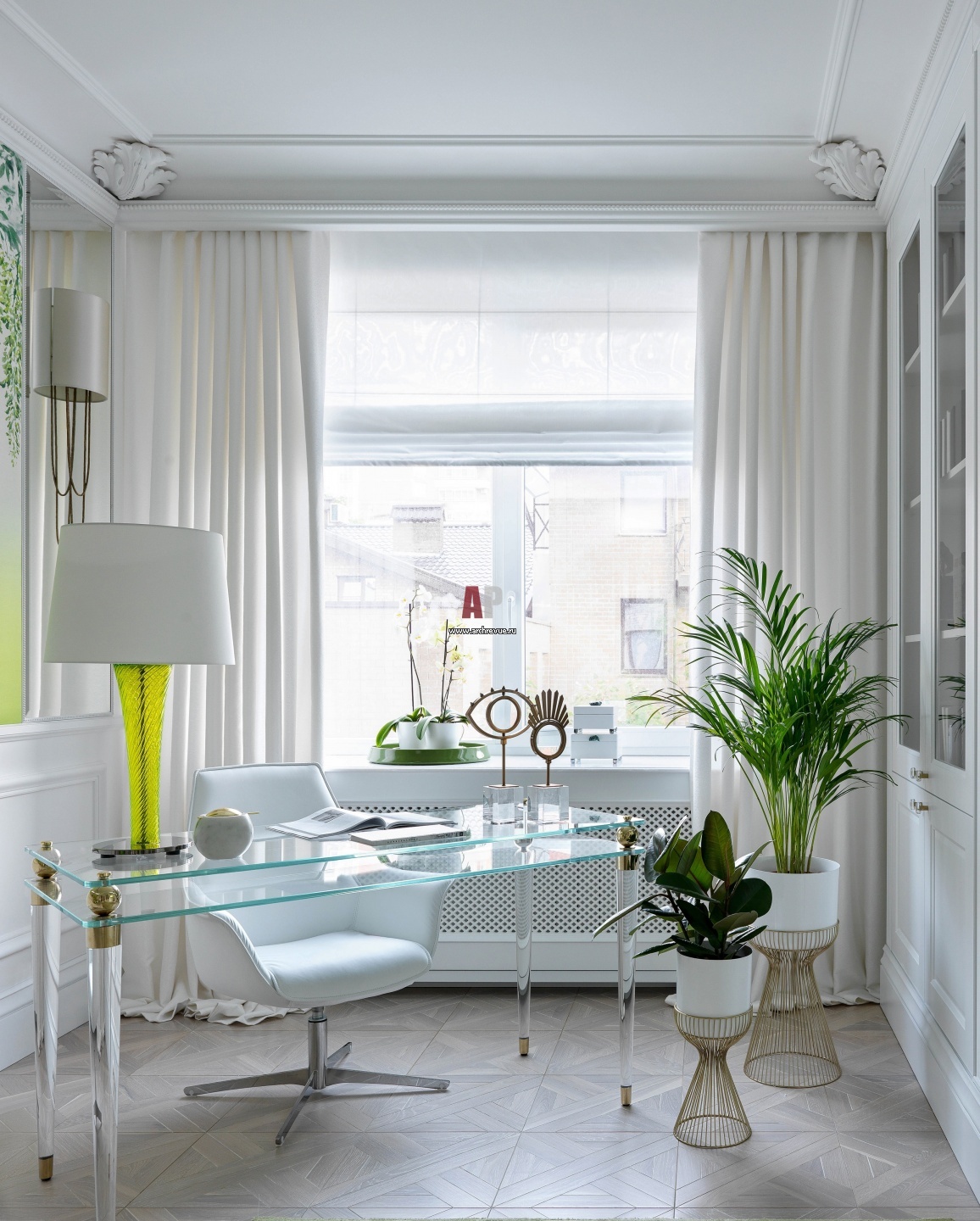 Кабинет выдержан в едином стиле с квартирой и выполнен в нехарактерной для такого помещения светлой палитре. На полу – модульный паркет из выбеленного дуба. По углам размещены ажурные лепные виньетки. Стеклянный письменный стол, Caracole. Кресло, Kastel. Бра, Porta Romana. Настольная лампа, Barovier & Toso.