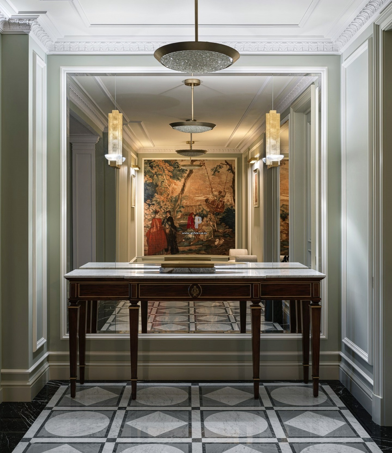 Торжественный характер прихожей формируют мраморные полы с крупным рисунком, гобелен с копией классического французского сюжета и многочисленные настольные лампы.