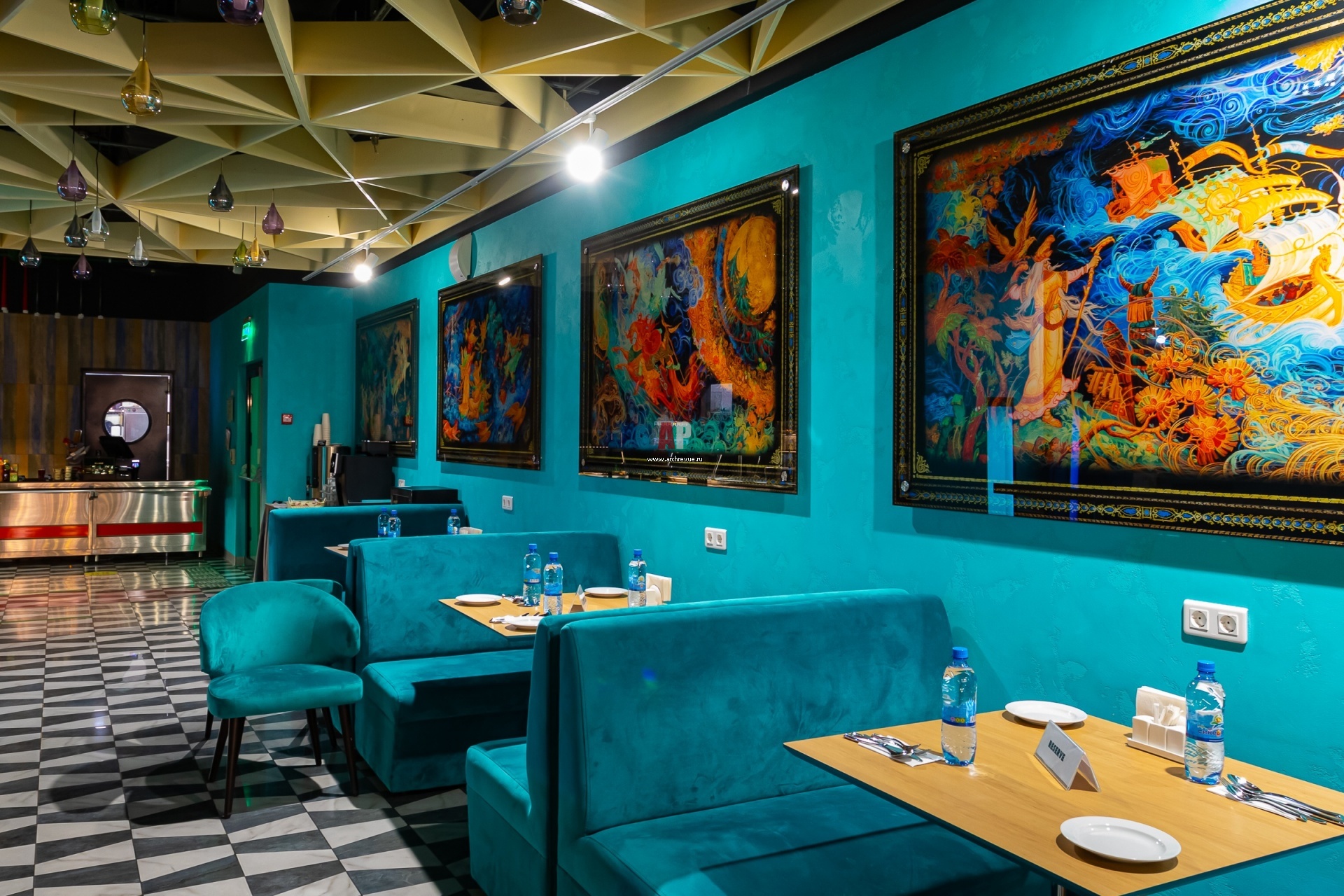 Дворец гимнастики Ирины Винер-Усмановой в Лужниках. Интерьер ресторана. На стенах – панно в духе палехской миниатюры.