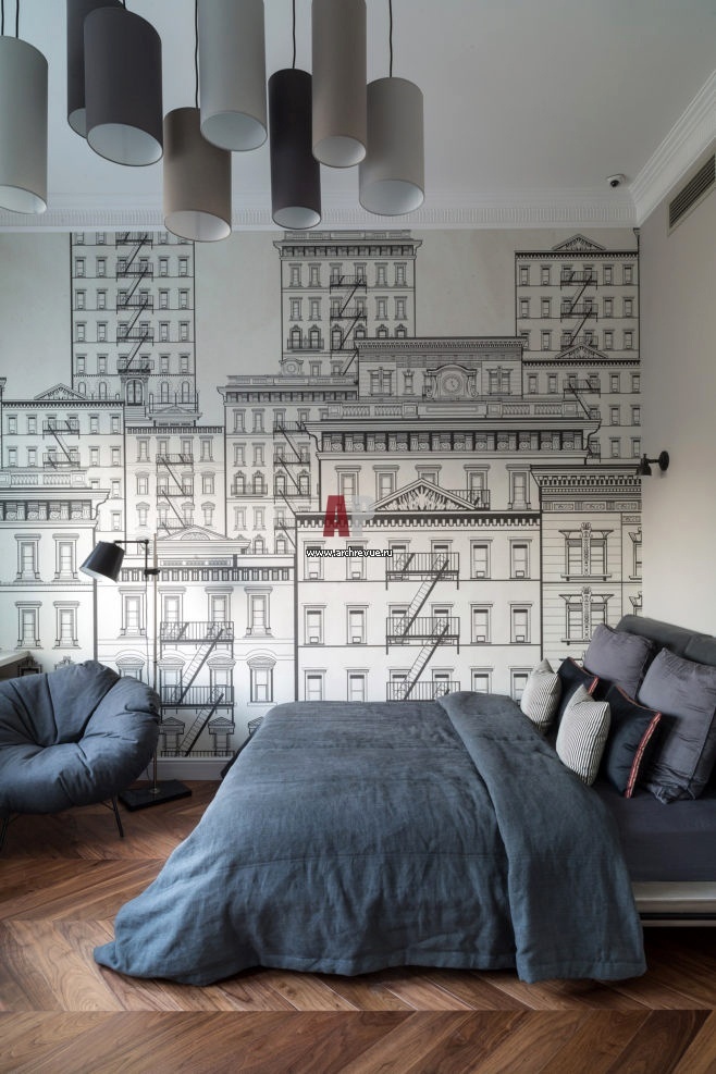 Детская спальня с графичными обоями и синим текстилем. Кровать, Shake Design. Кресло, Mogg. Люстра, Stephane Davidts. Бра, Restoration Hardware. Торшер, Arteriors.