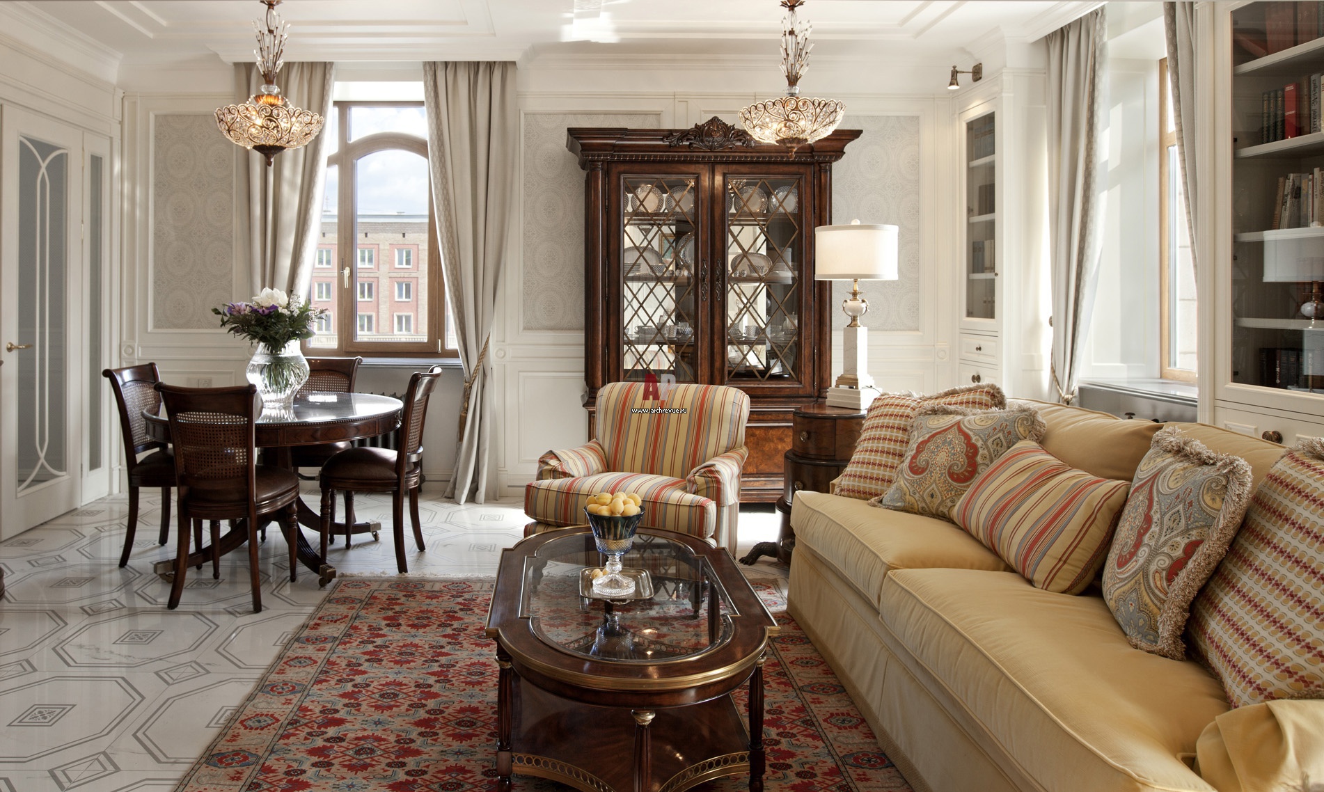 Интерьер гостиной в стиле неоклассика. Деревянные окна в духе московского модерна сделаны на заказ по эскизам архитектора. Шторы убраны под лепные карнизы из гипса.