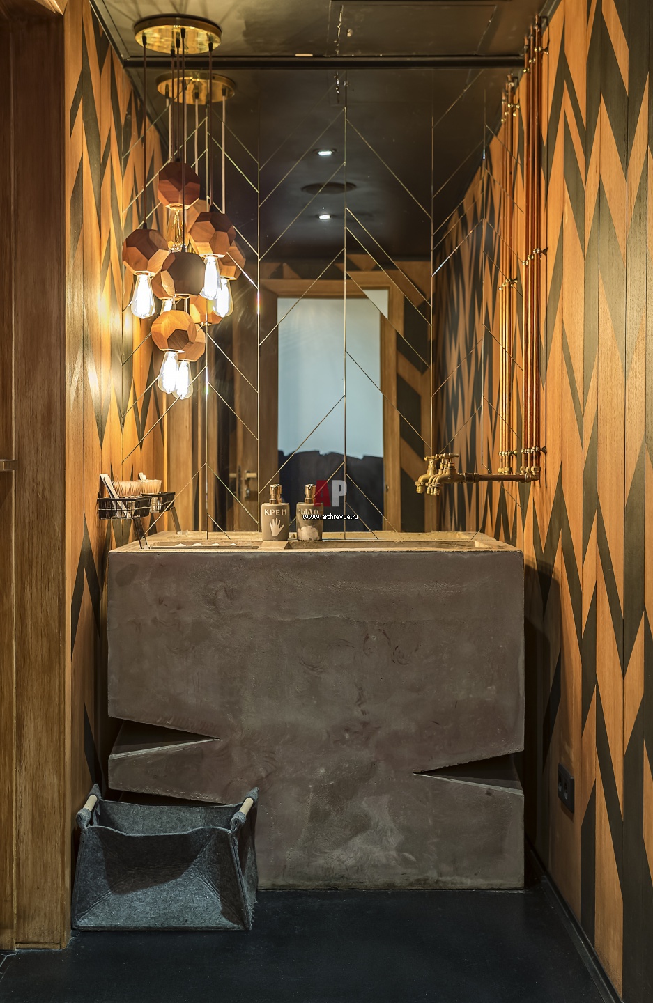 Санузел с раковиной из бетона. Стены зашиты деревянными панелями в виде елочки, каждая плашка выкрашена вручную.