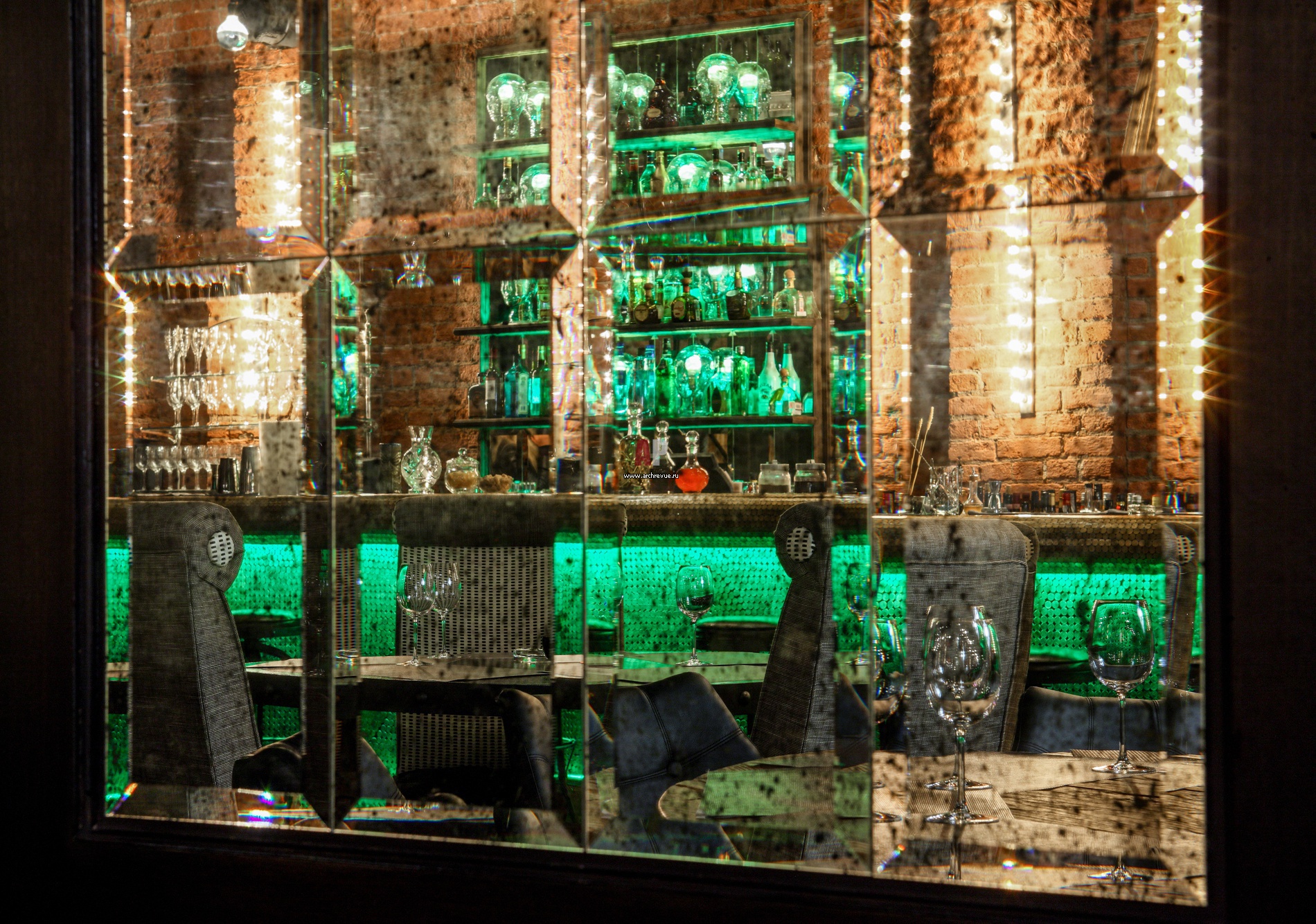 Стены и перегородки оформлены состаренными зеркалами. Чтобы добиться эффекта муара, их травили кислотой.