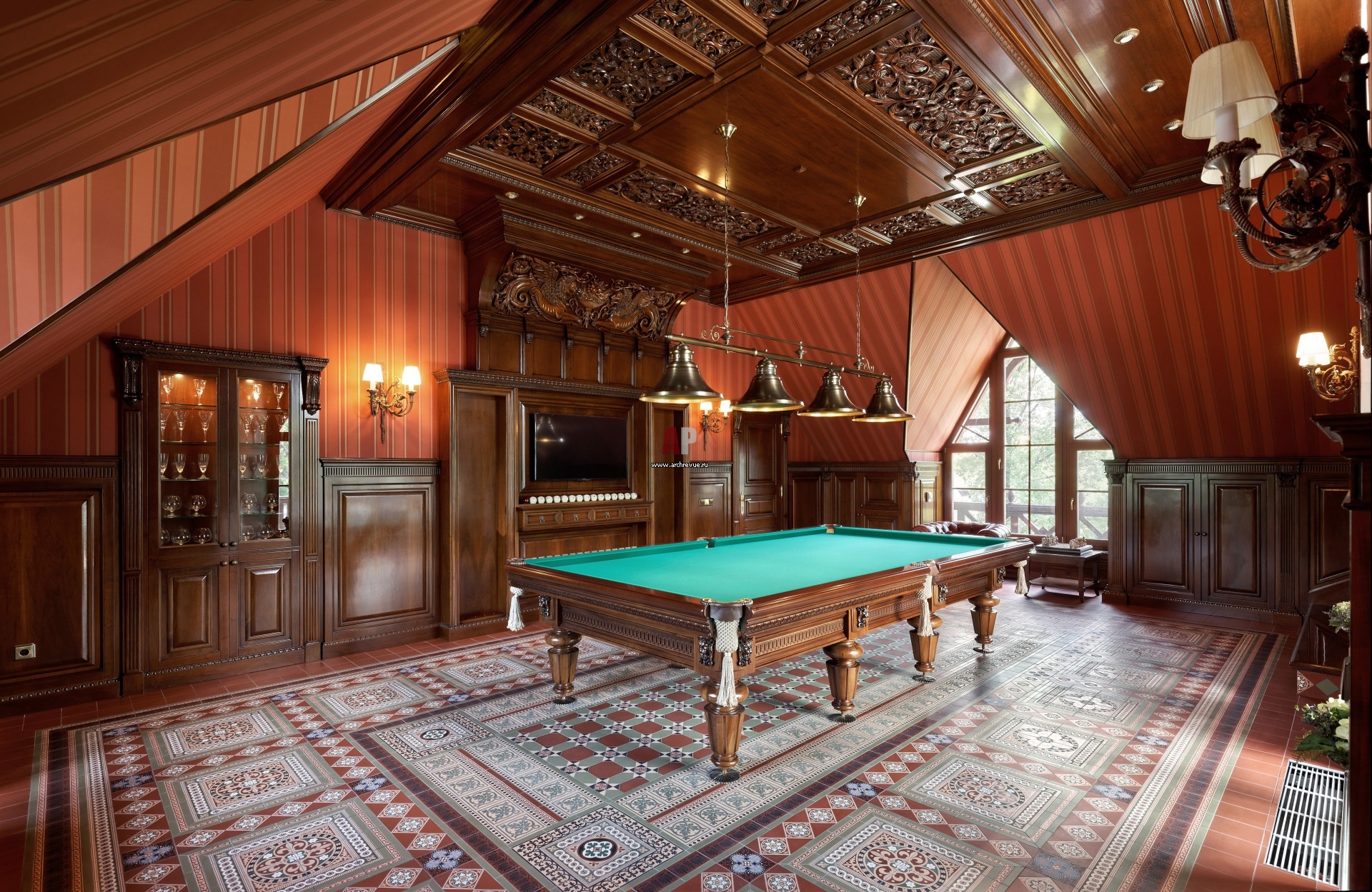 Большую часть мансардного этажа занимает бильярдная в викторианском стиле. Украшение помещения – напольное керамическое панно из английской плитки, Original Style. Настенные и потолочные панели из тонированного ореха украшены резьбой, они выполнены фабрикой Francesco Molon по эскизам дизайнера.
