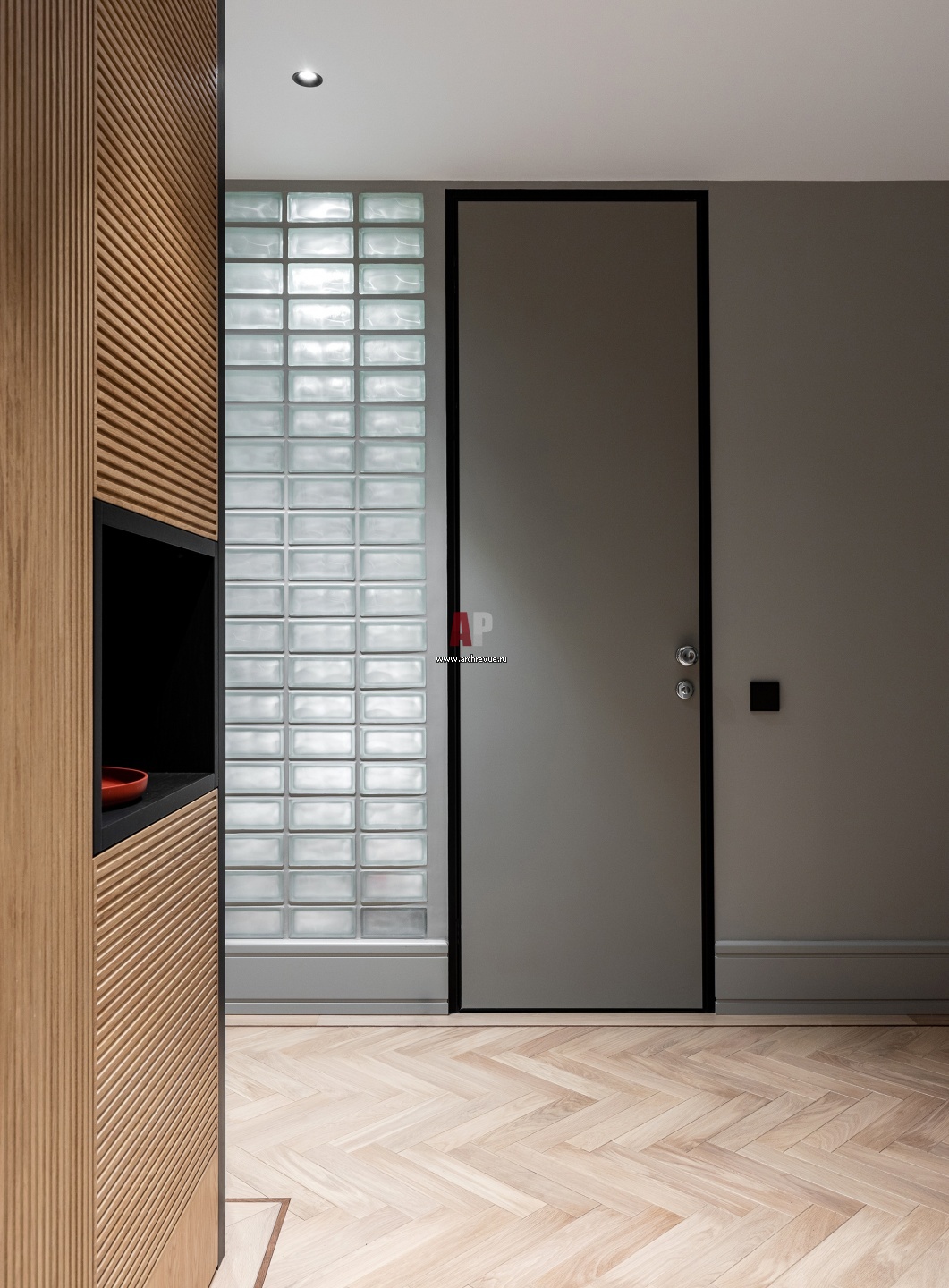 Вид из холла на гостевой санузел. Он оформлен стеклоблоками, они освещают помещение и создают настроение выбранной эпохи.
