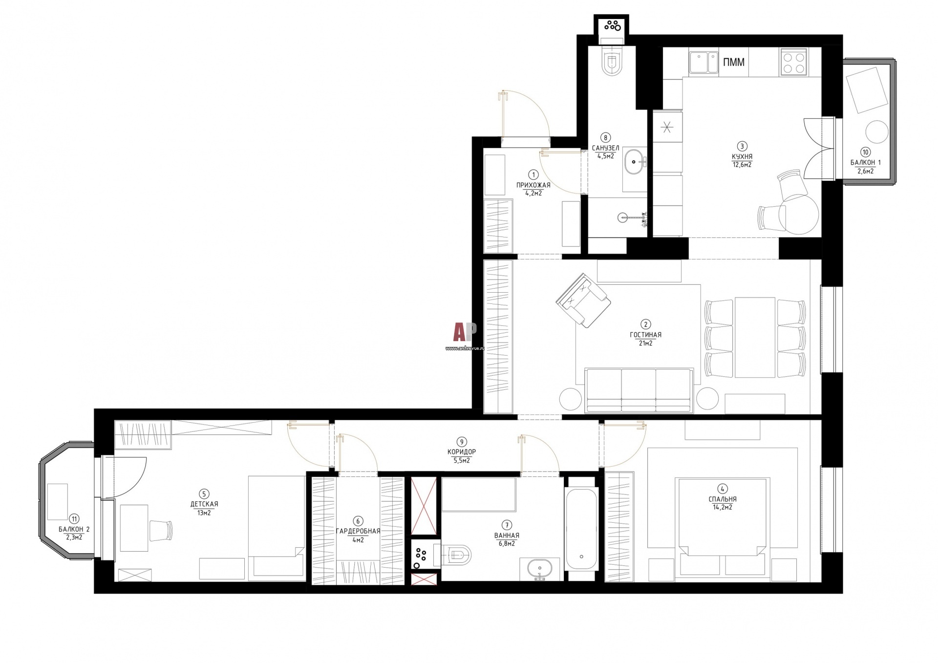 Планировка 3-х комнатной квартиры с двумя изолированными спальнями.