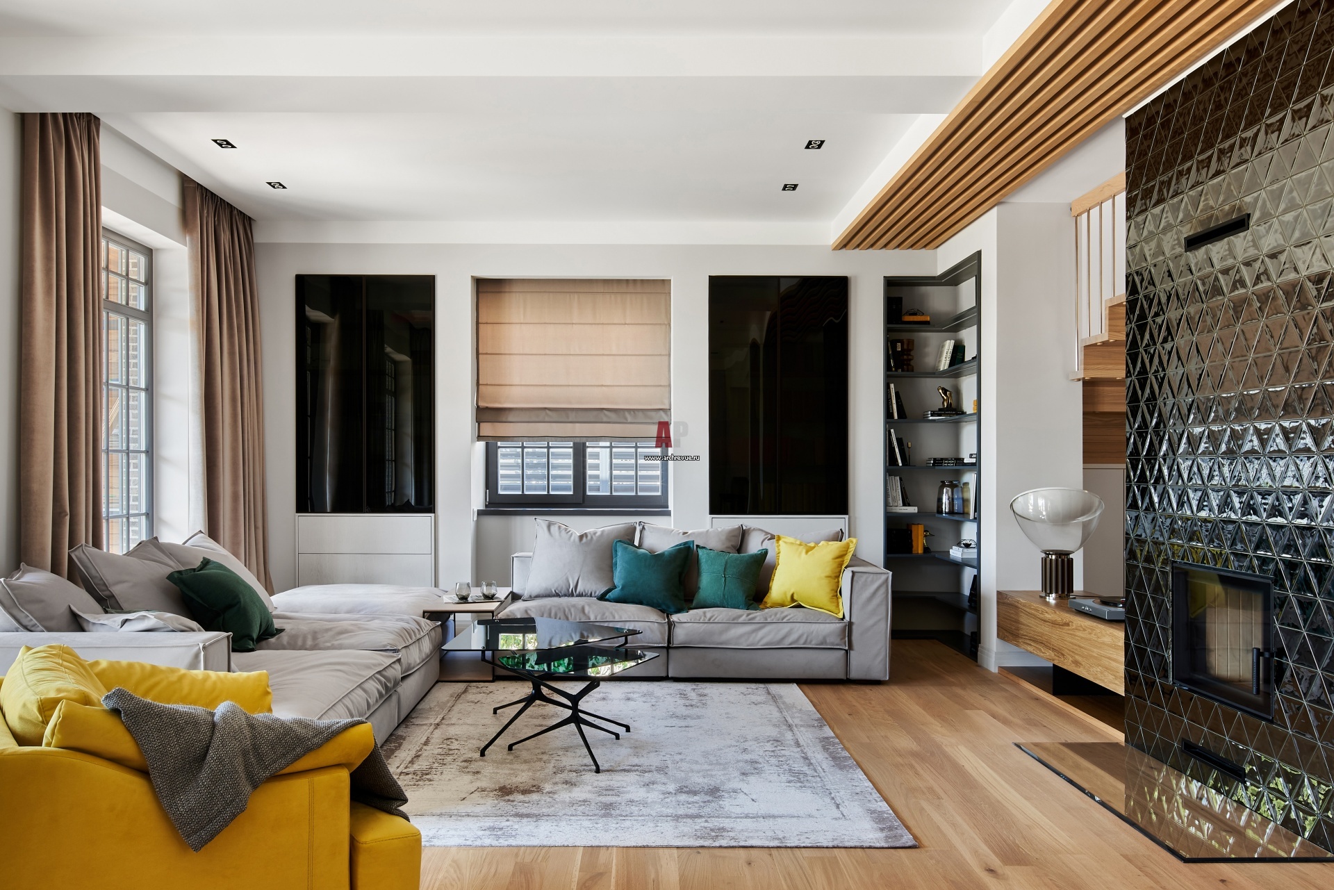 В нишах по обе стороны от окна находятся встроенные шкафы с семейной библиотекой. Их фасады оформлены черным стеклом, Dark Grey. Встроенная мебель, Raumplus.