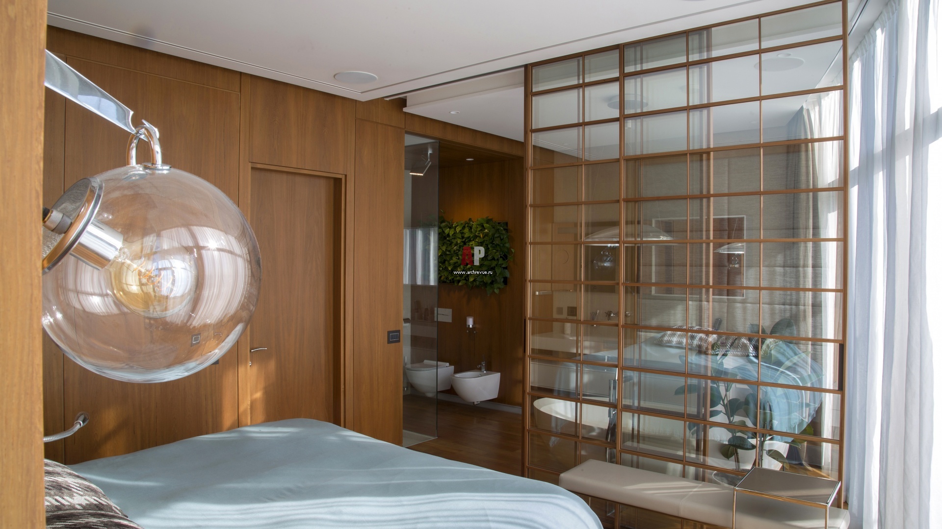 Стены хозяйской комнаты по периметру зашиты стеновыми панелями из шпонированного тика, из него выполнены и двери, изготовление «КингВуд». Стеклянная раздвижная перегородка, Rimadesio.