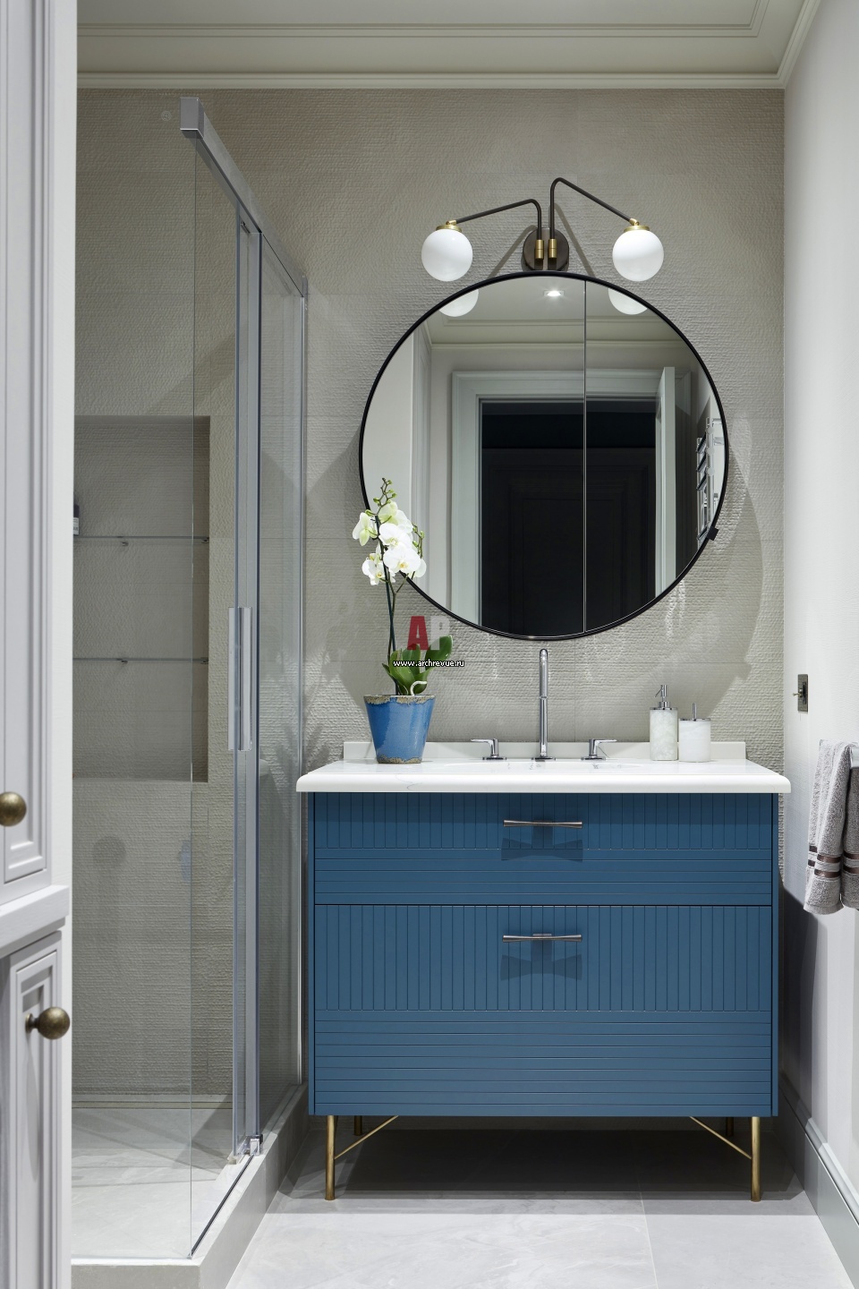 Детская ванная комната с душевой. Стены облицованы керамогранитом FAP. Тумба под раковину насыщенного бирюзового цвета изготовлена на заказ. Раковина Villeroy & Boch. Смесители Axor, Hansgrohe. Cветильник, CTO Lighting.