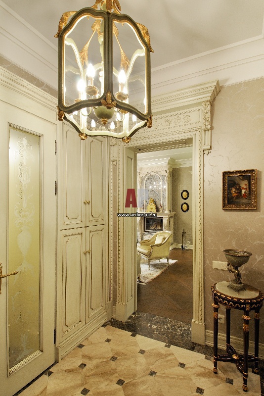 Зона холла оформлена в песочной цветовой гамме. Полы выложены мрамором, компания Estro. Дверцы встроенных шкафов со стеклом украшены тонким рисунком, выполненным с помощью пескоструйной техники по эскизам авторов. Пескоструйные работы по стеклу Леонид Лившиц, компания Lumi.