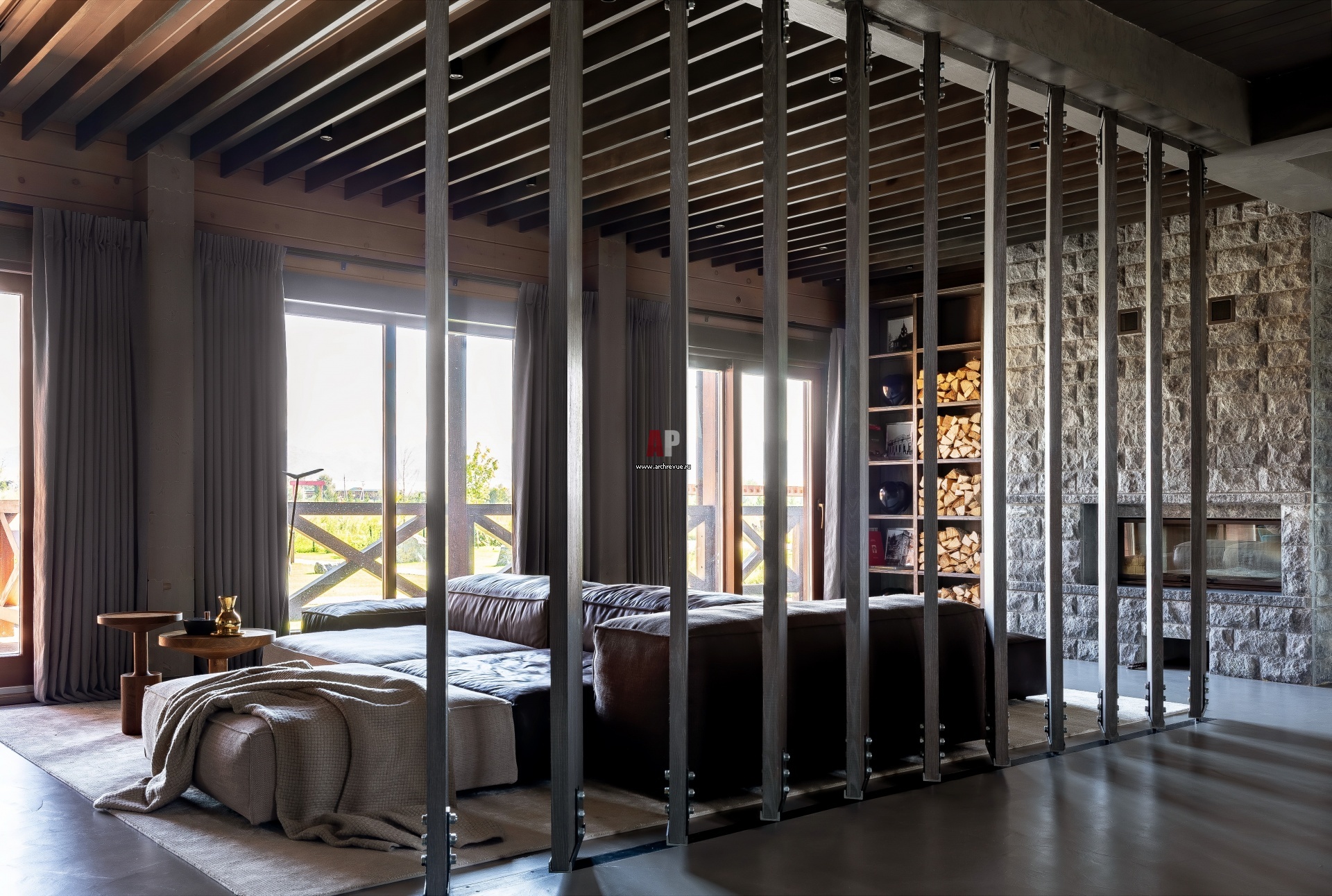 Зона отдыха на первом этаже т главной гостиной обособлена поворотными деревянными ламелями. Она включает каминный зал и телевизионную группу. Их объединяет двухсторонний диван, Living Divani.