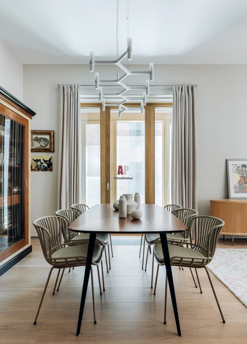 Столовая зона в гостиной. На полу жилых помещений – инженерная доска из дуба нестандартной, увеличенной ширины. Стол обеденный, La Redoute. Стулья обеденные, LaForma. Светильник, Nemo.