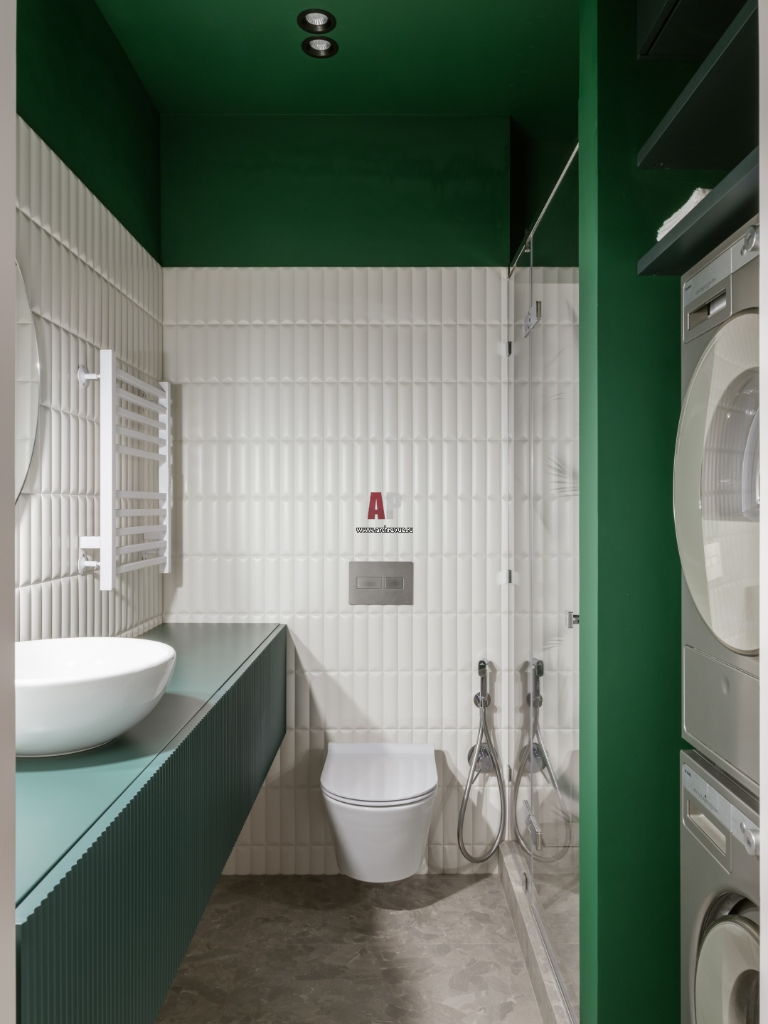 Гостевой санузел, он же мужской, с функциями постирочной. Стены окрашены в глубокий оттенок зелени.