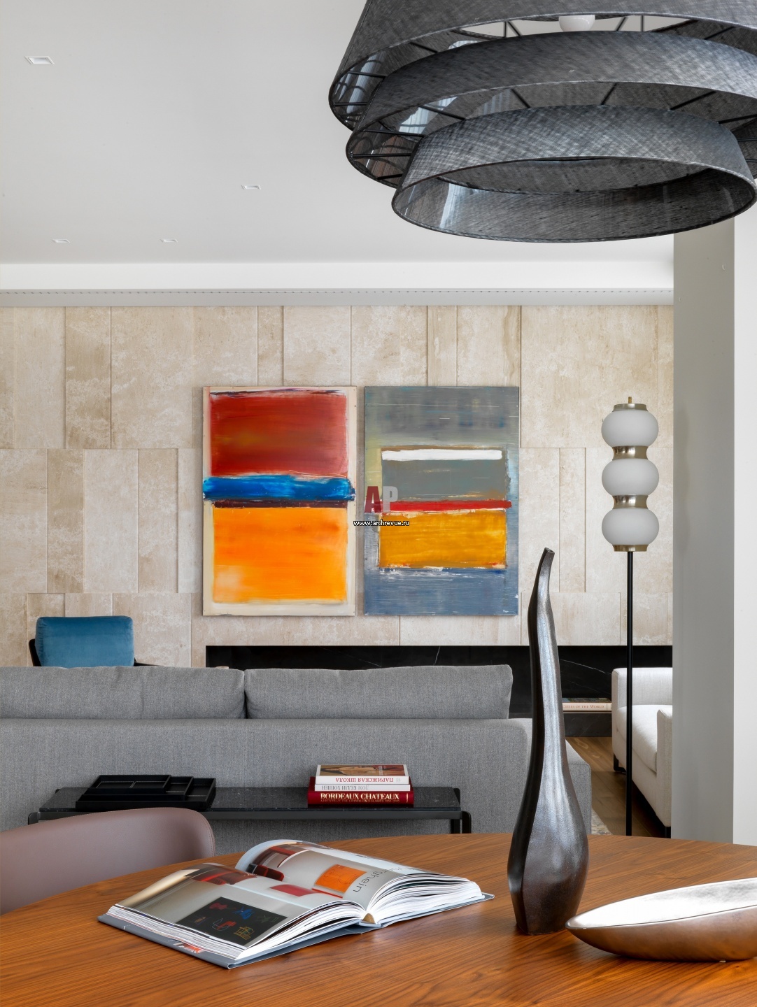 Вид из зоны столовой на гостиную. Диван и консоль, Molteni&C. Светильник, Cattelan Italia. Торшер, винтаж.