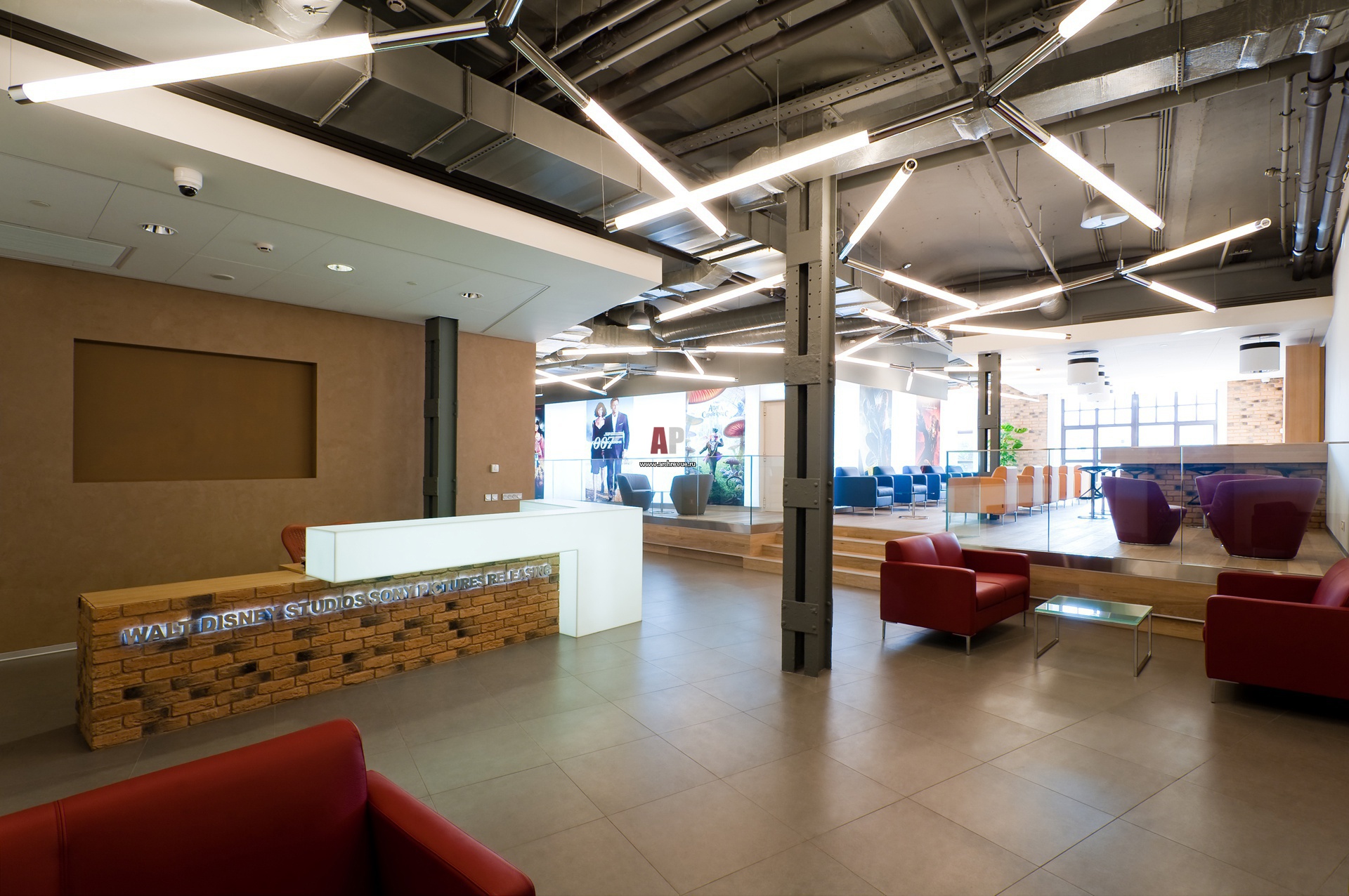 Стойка ресепшн во входной зоне изготовлена из белого кориана со встроенной подсветкой. Архитекторы хотели добиться эффекта отколовшегося от айсберга фрагмента.