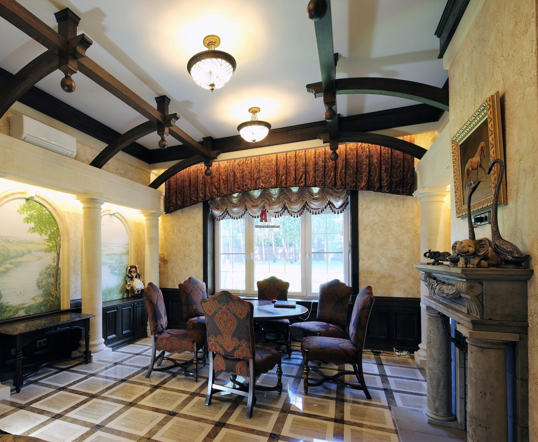 Чилл-аут или малая гостиная предваряет вход в бассейн. В оформлении использована тема средиземноморской беседки. Потолки украшены темными балками, в арочных нишах – росписи, портал камина решен в виде массивных полукруглых колонн с портиком, мебель выглядит массивно.