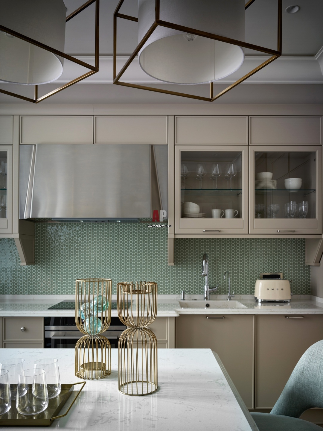 Семейная квартира с элементами американской классики и ар-деко. Интерьер кухни. Кухонный фартук отделан мозаикой мятного оттенка.