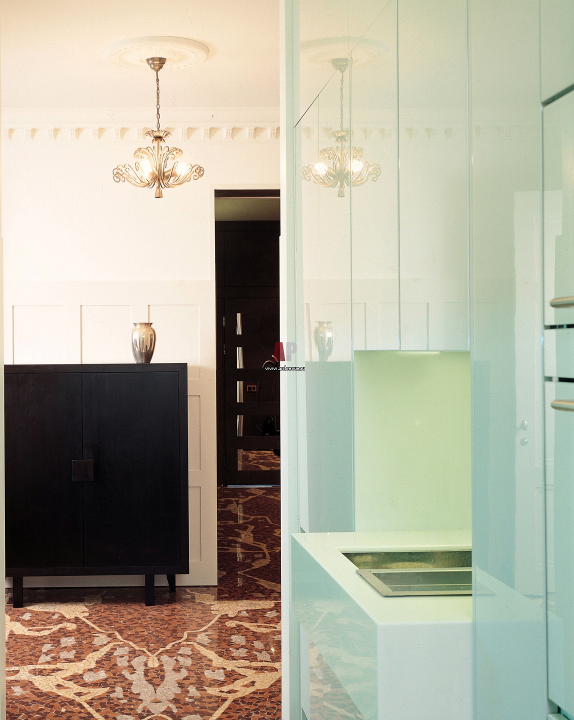 Холл, кухня и столовая объединены общим мозаичным оформлением пола. Художник Савва Архипов.
