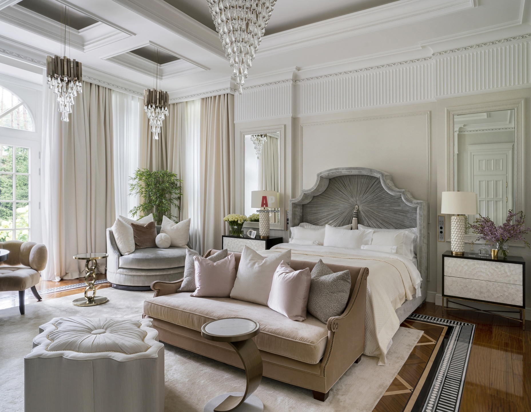 Хозяйская спальня расположена на перовом этаже. Она оформлена в мягкой цветовой палитре и выглядит очень нарядно. Кровать со стилизованным балдахином и кушетка, Haute House. Фасады прикроватных тумб, Bernhardt украшены перламутром. Кресло, Marge Carson. Столики, Bernhardt, Caracole. Люстры в виде гроздьев винограда, Luxxu.