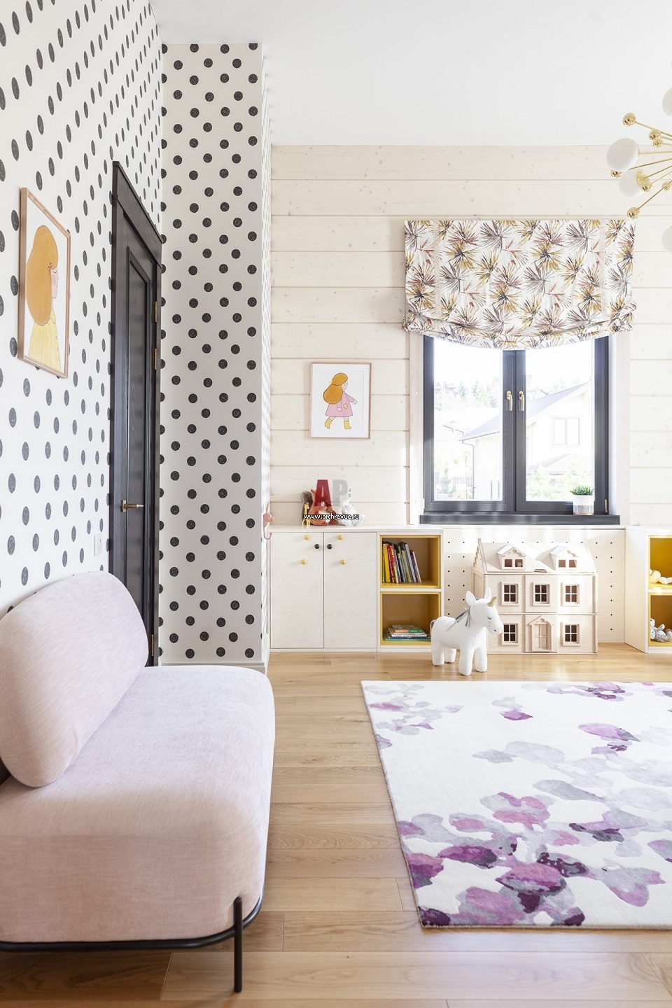 Детская дочери выполнена в светлых цветах. У окна сделана удобная система хранения – шкафчики для игрушек.