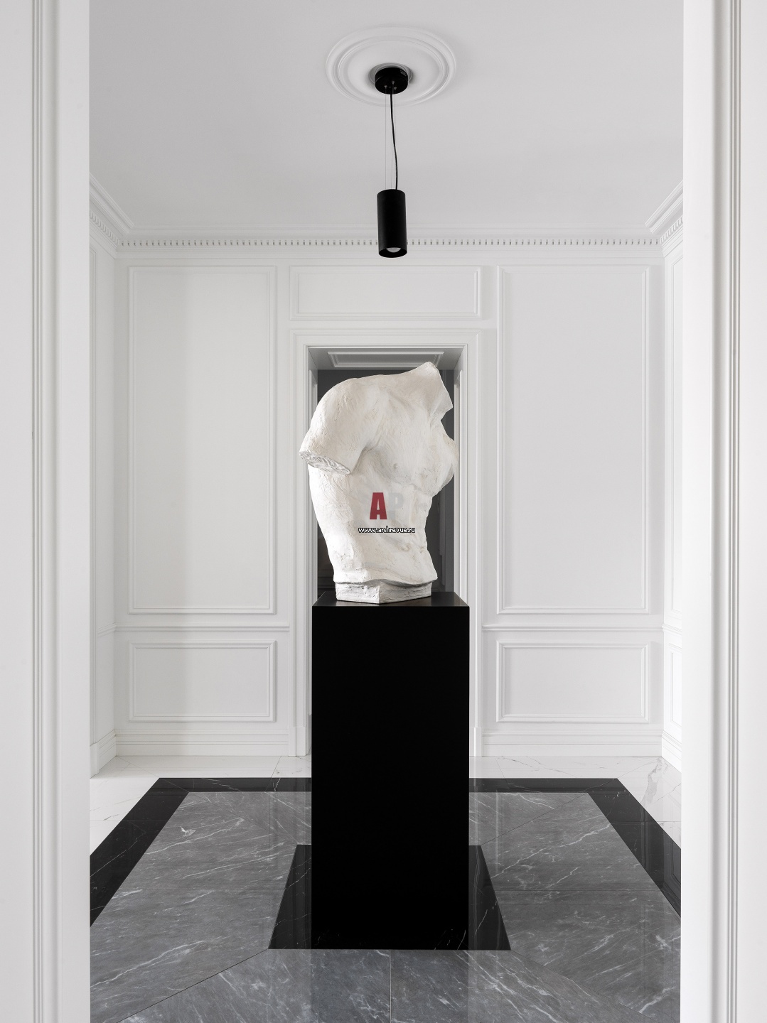 Холл. Торс по мотивам скульптуры Антуана Бурделя из коллекции его дома-музея в Париже, скульптор Василий Вершинин, гипс, тонировка. Постамент изготовлен на заказ. Бра выполнены на заказ, Artbronze. Подвесной светильник над торсом, Estiluz, модель Cyls.
