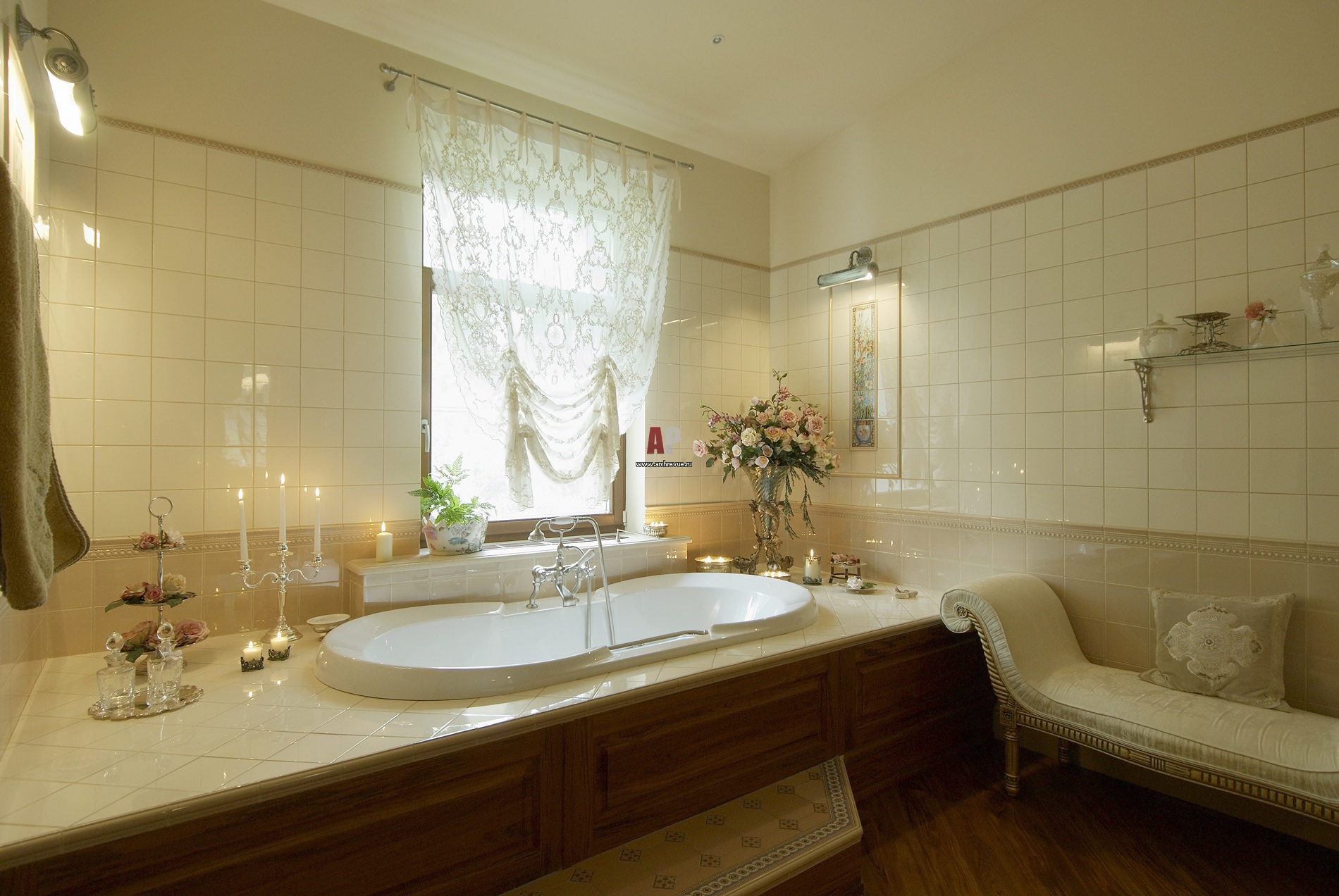 Ванна в хозяйской ванной комнате поставлена на подиум. Он облицован деревянными панелями. Ступенька выложена плиткой с рисунком в английском стиле.