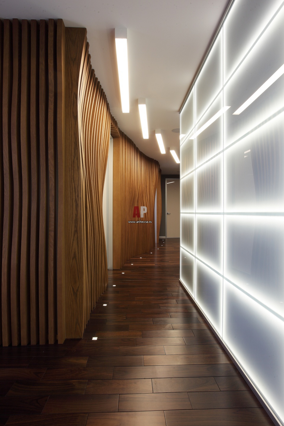 Коридор образован с одной стороны стеной из светящихся стеклянных панелей, другая стена имеет волнообразную форму. Она набрана из массивных деревянных реек. Работы по дереву, «АФ Ника».