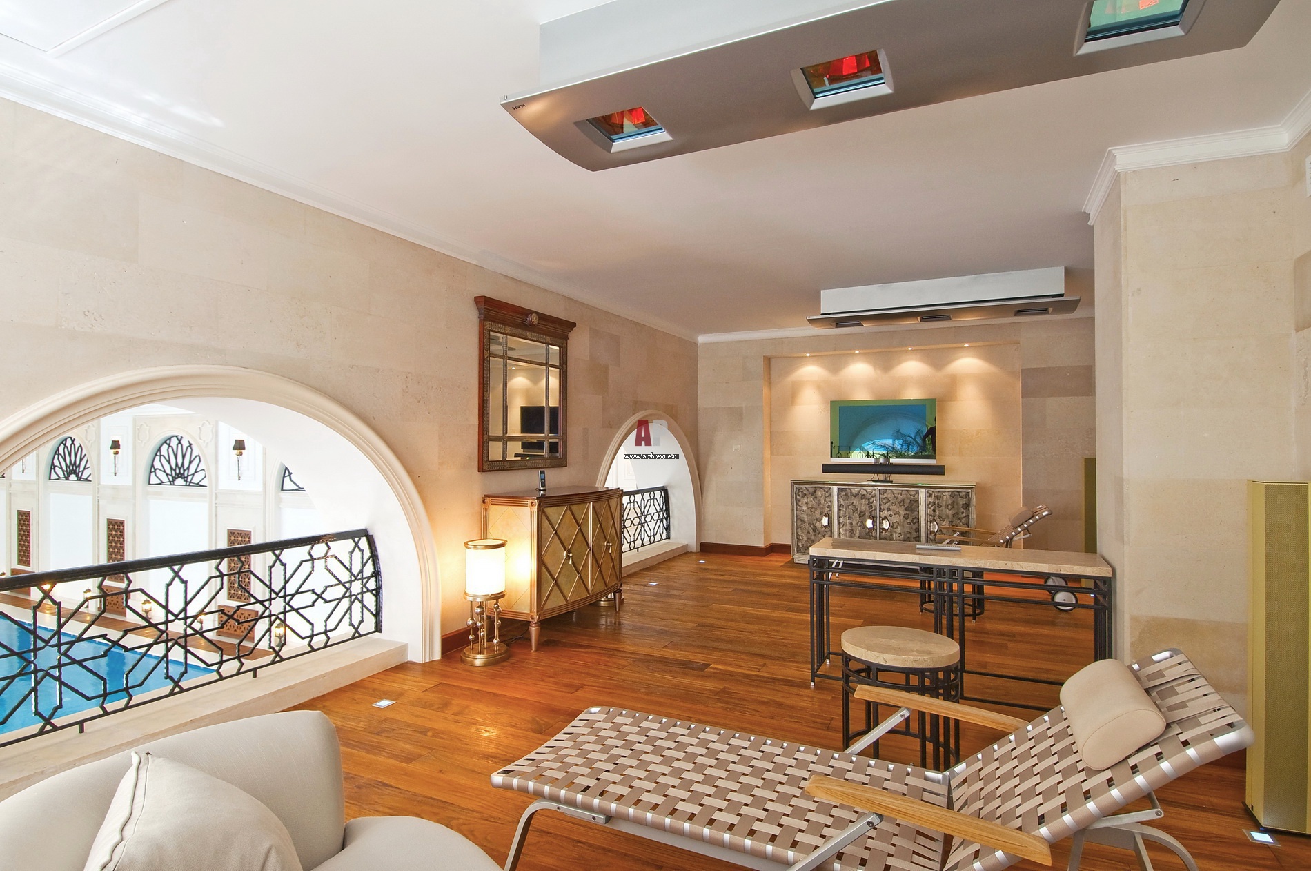 Большая высота бассейна позволила надстроить компактную антресоль. На ней разместилась зона отдыха с солярием и шезлонгами.