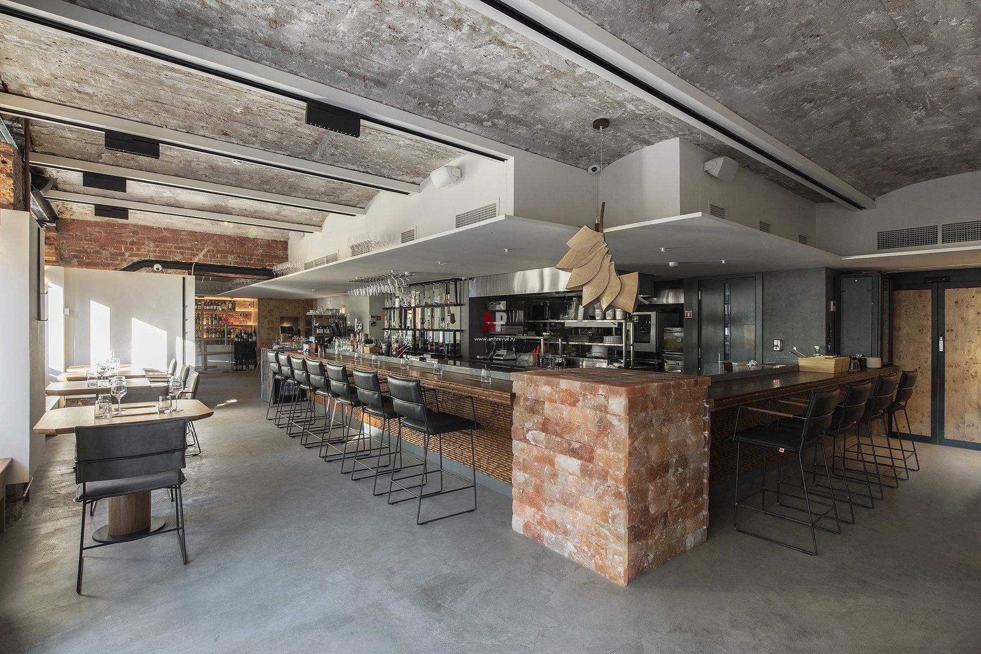 В центре основного зала – барная стойка, она защита светлым деревом. Опоры сложены из плит гималайской соли. Барные стулья из металлических прутьев и черной кожи сделаны на заказ.