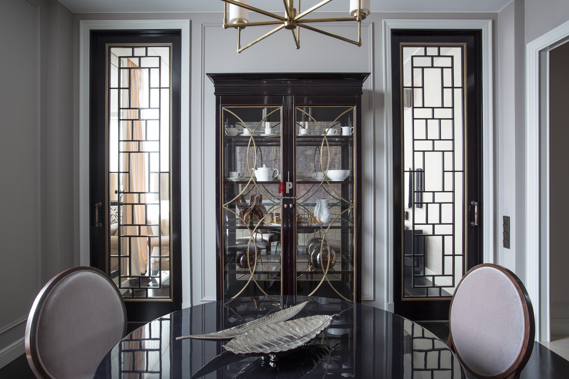 Симметричные вертикальные раздвижные двери из стекла с латунным узором, в обрамлении темного лакированного дерева выполнены по эскизам автора проекта в итальянском ателье. В том же стиле исполнен и авторский буфет из шпона красного дерева. В нем есть подсветка, и в вечернее он смотрится особенно парадно.