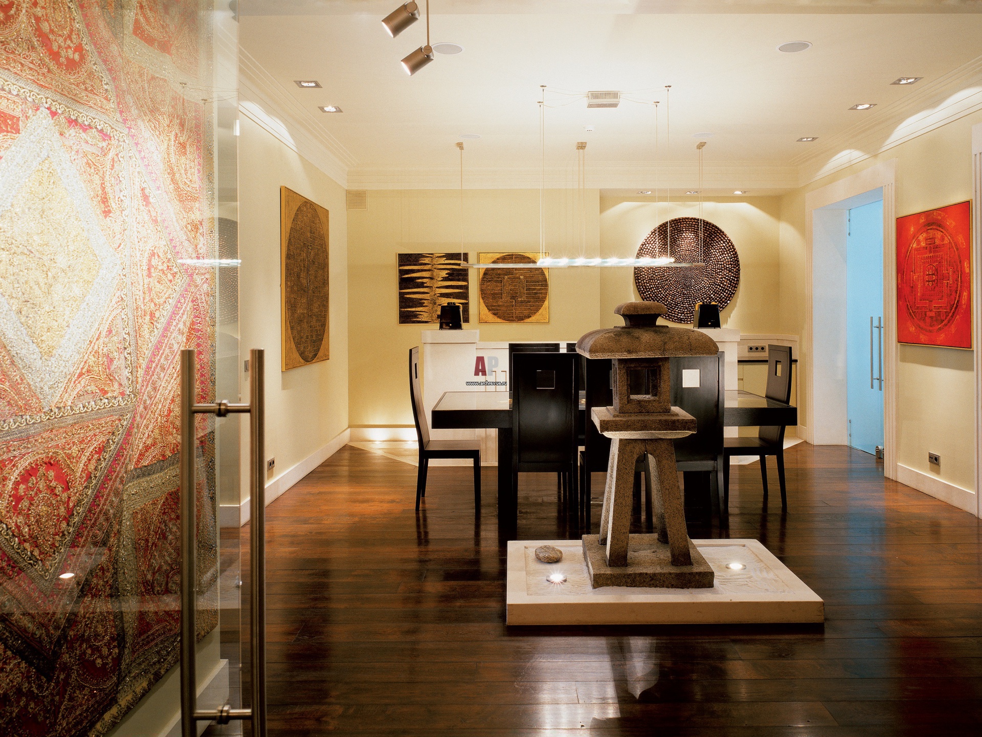 Переговорная расположена за распашными стеклянными дверями, рядом с японским фонарем XVII века из необработанного гранита. Антикварный ковер выполнен вручную. Вместо переговорного стола здесь обрамленная в стекло и установленная на опоры деревянная плита, которая украшала вход в тибетский храм.
