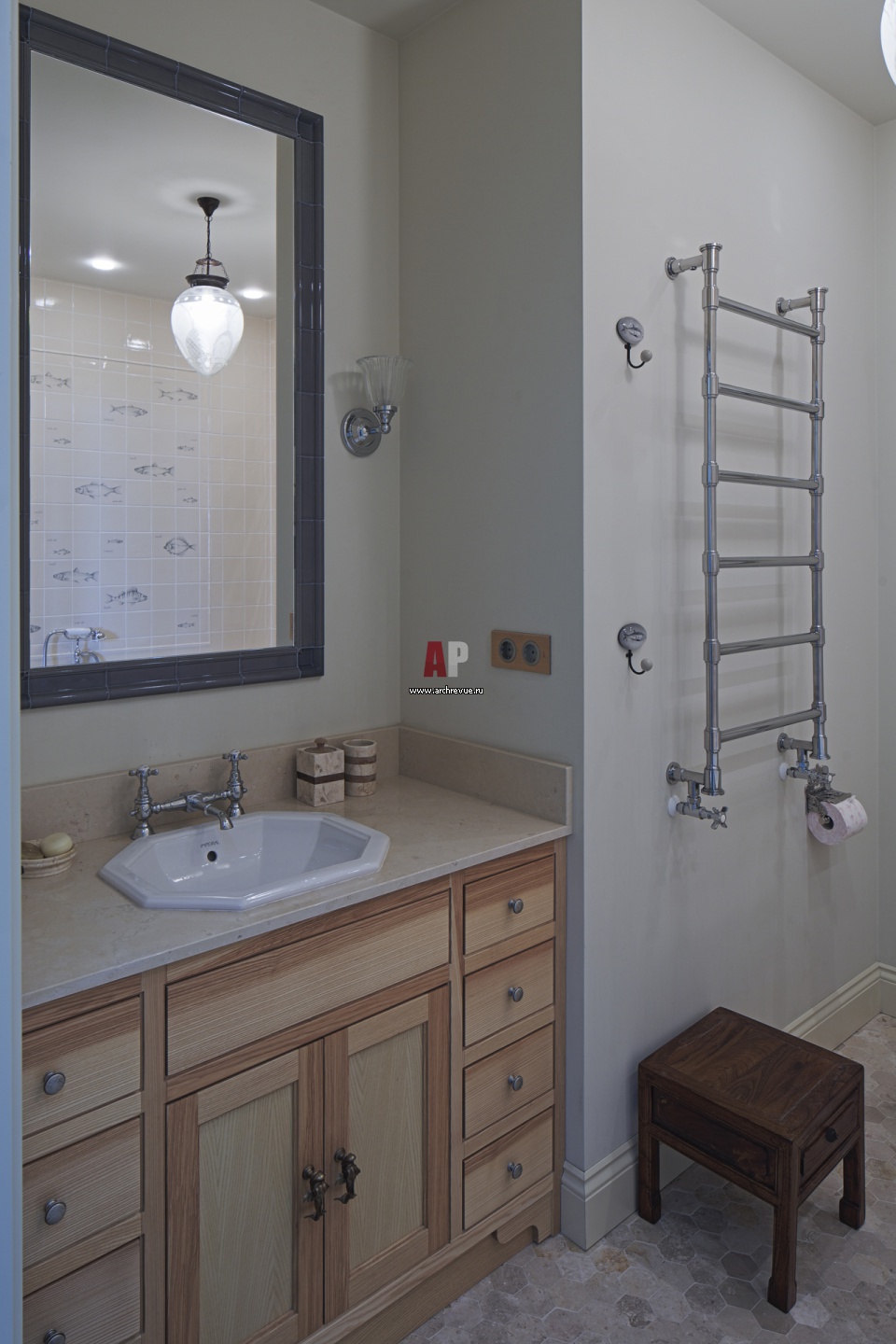 Фото интерьера детской ванной комнаты. На полу – плитка из травертина в форме многогранника. Каменные «соты» изготовлены в Италии под индивидуальные размеры помещения.